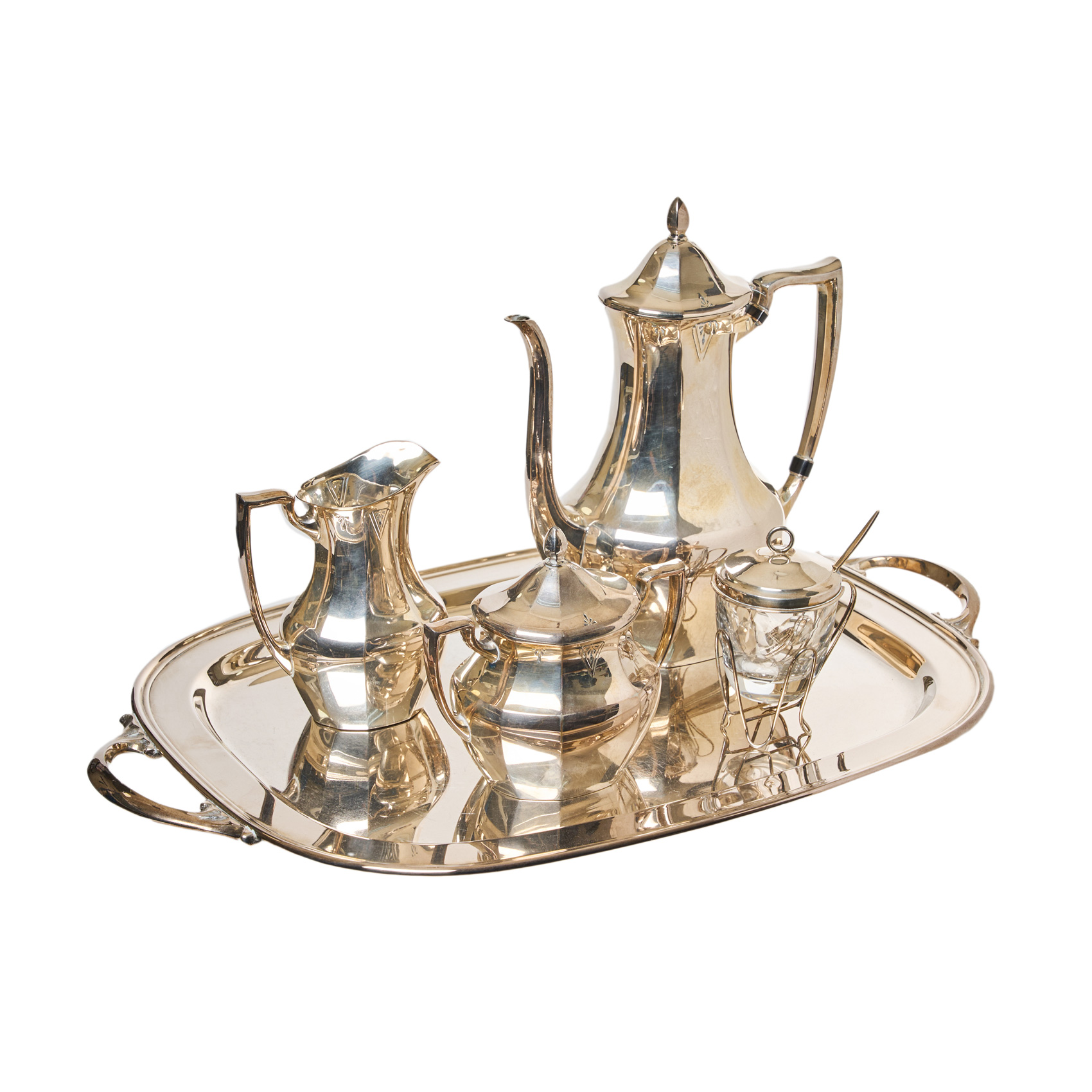 Juego de café de cinco piezas en metal plateado, s.XX. Formado por bandeja, dos azucareros, cafetera y lechera.