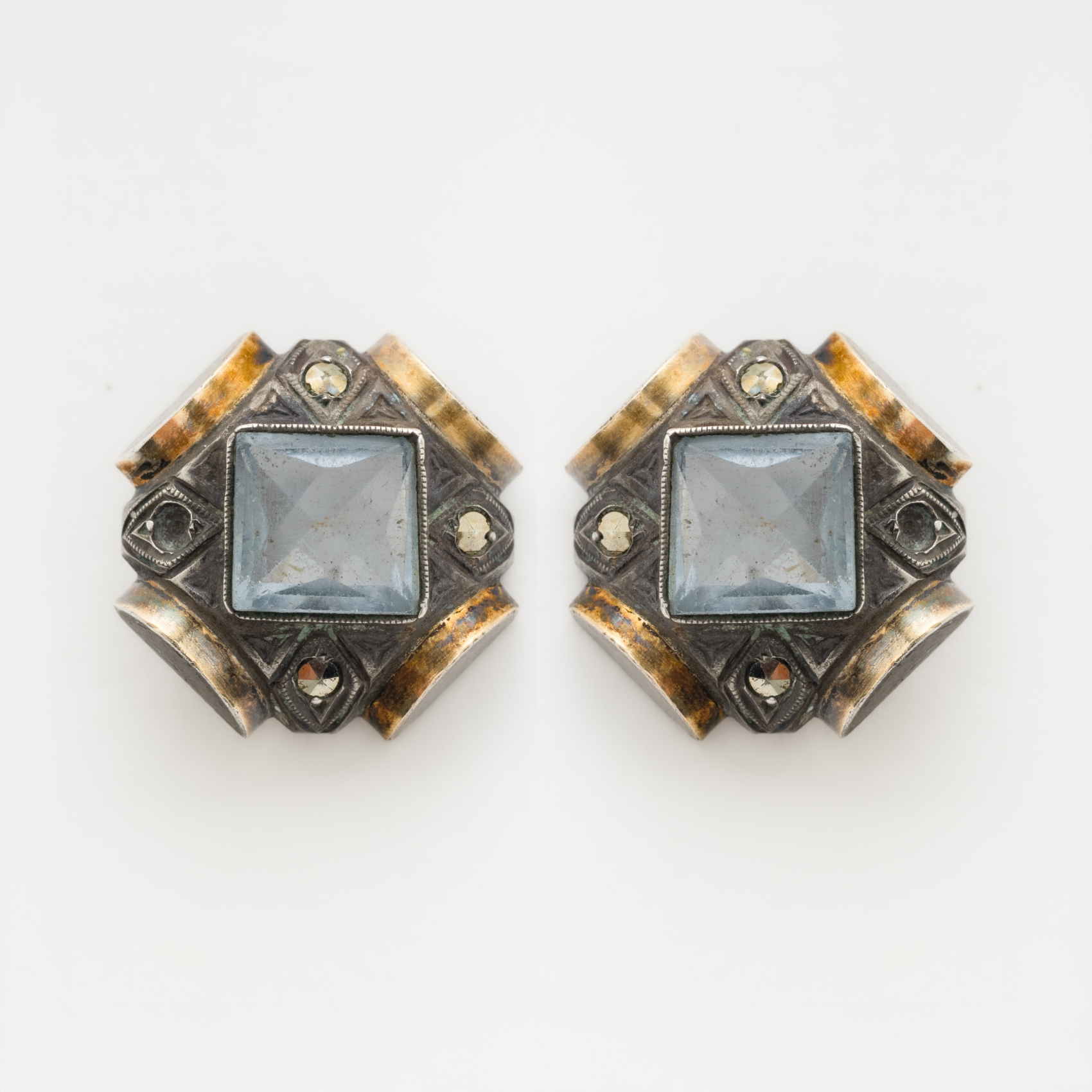 Pendientes en plata y vistas en plata dorada con símil de aguamarina de 8 x 8 mm y marquesitas, c.1940. Estimación:300 – 480€