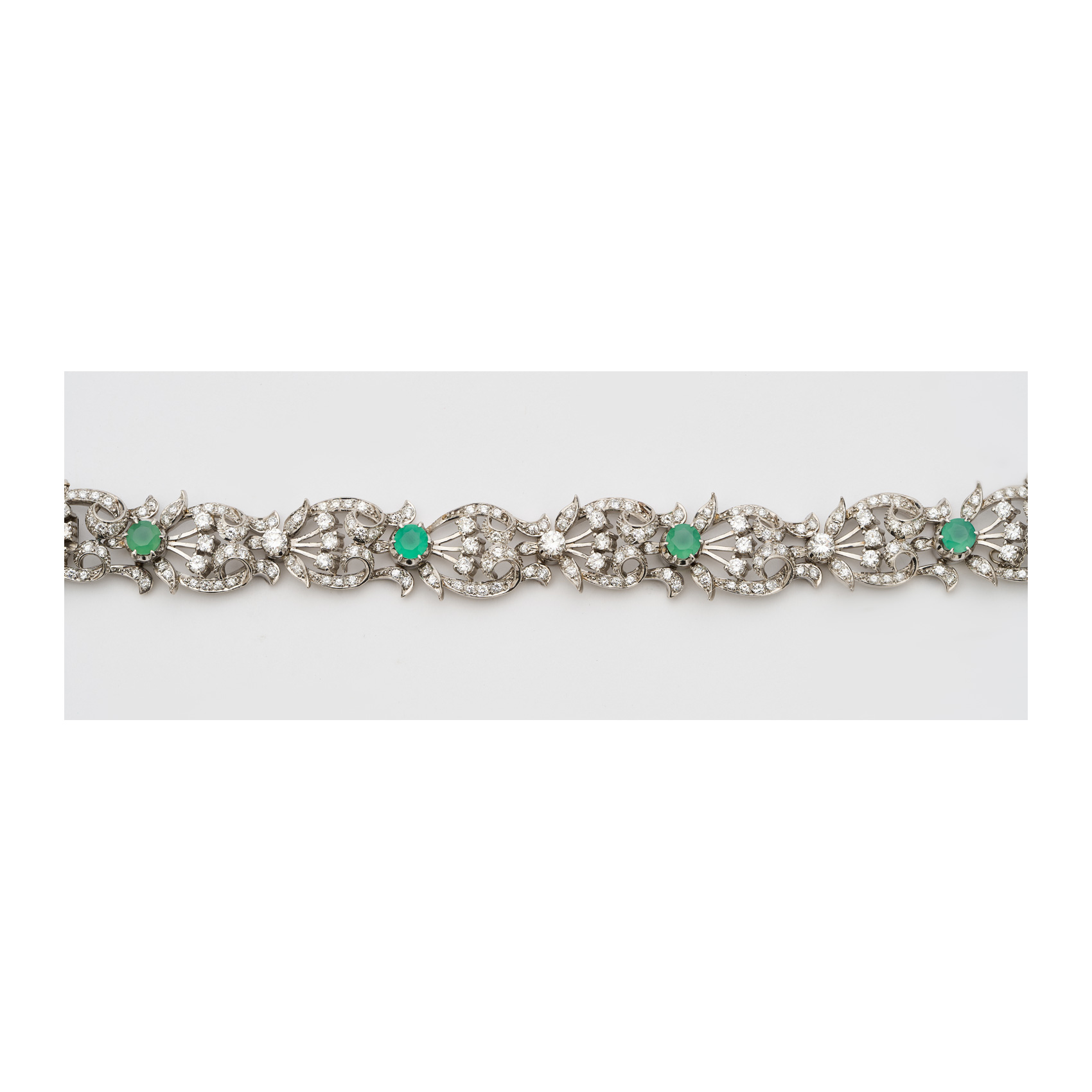 Pulsera en oro blanco formada por eslabones calados con hojitas y roleos de diamantes talla brillante y crisoprasas talla redonda de 6 mm. engastadas en garras.