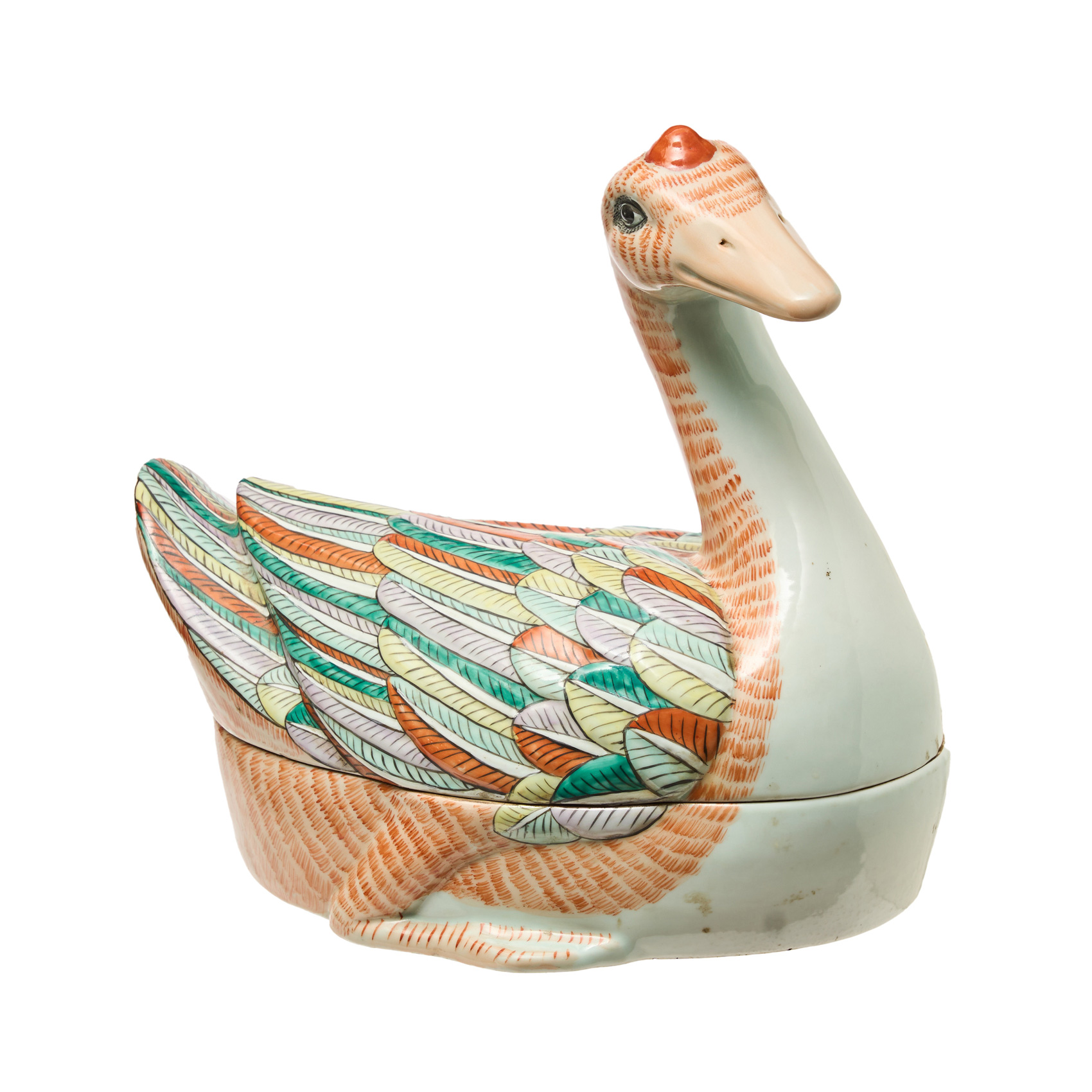 Huevera china en porcelana esmaltada en forma de pato, s.XX. Marcas en la base.