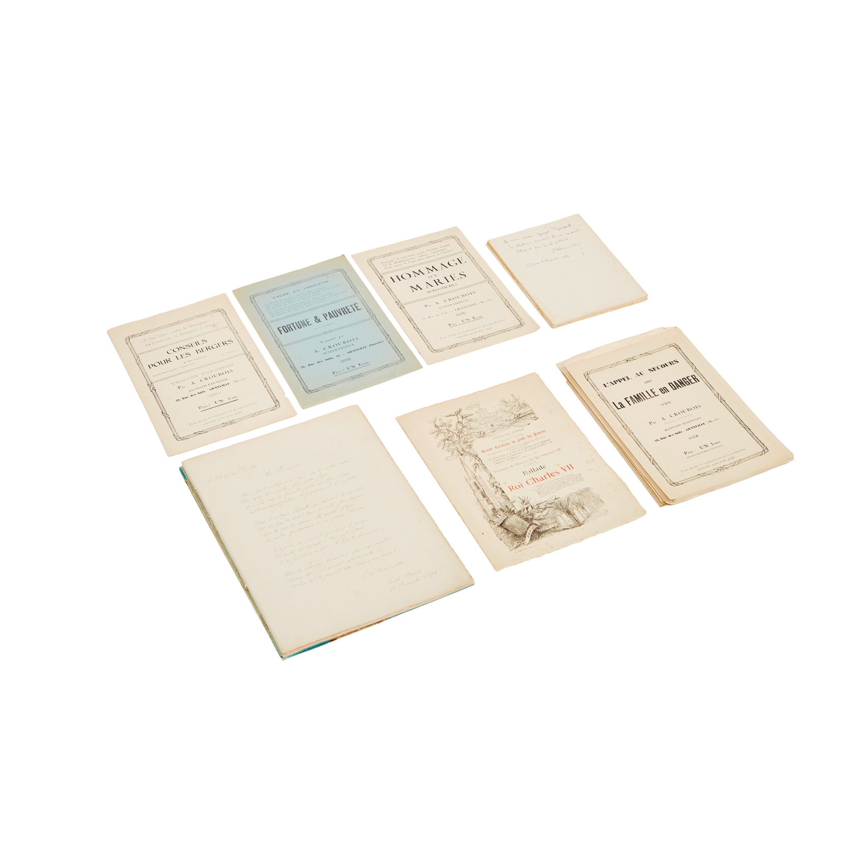 Julien l’Hermitte (Lille, Francia, 1863-Mans, Francia, 1947). Lote de escritos y documentos varios del archivista, historiador y poeta francés, s.XIX. Compuesto por el diario de viajes y estudio de la región del Limousin «En Limousin», archivos como los «Archives de l’Hôpital de Seclin»y el poemario «Images et Méditations» entre otros. Se acompaña de dibujo a plumilla, «La méditation de l’hermitte» dedicado a Julien l’Hermitte por G. Bèyur. Estimación:750 – 850€