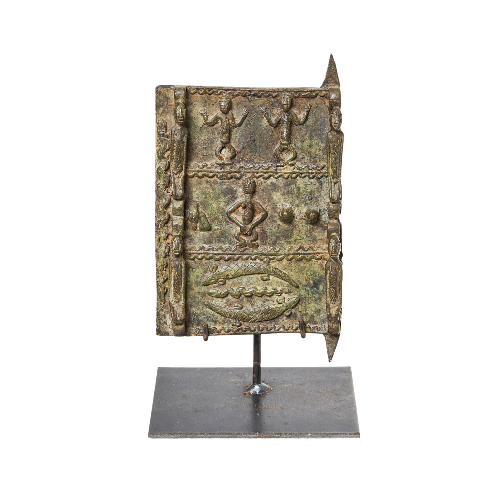 Mirilla de puerta ceremonial probablemente del África occidental en bronce con representaciones en altorrelieve de personajes, cocodrilos y serpientes, s.XX. Se acompaña de peana en metal.
