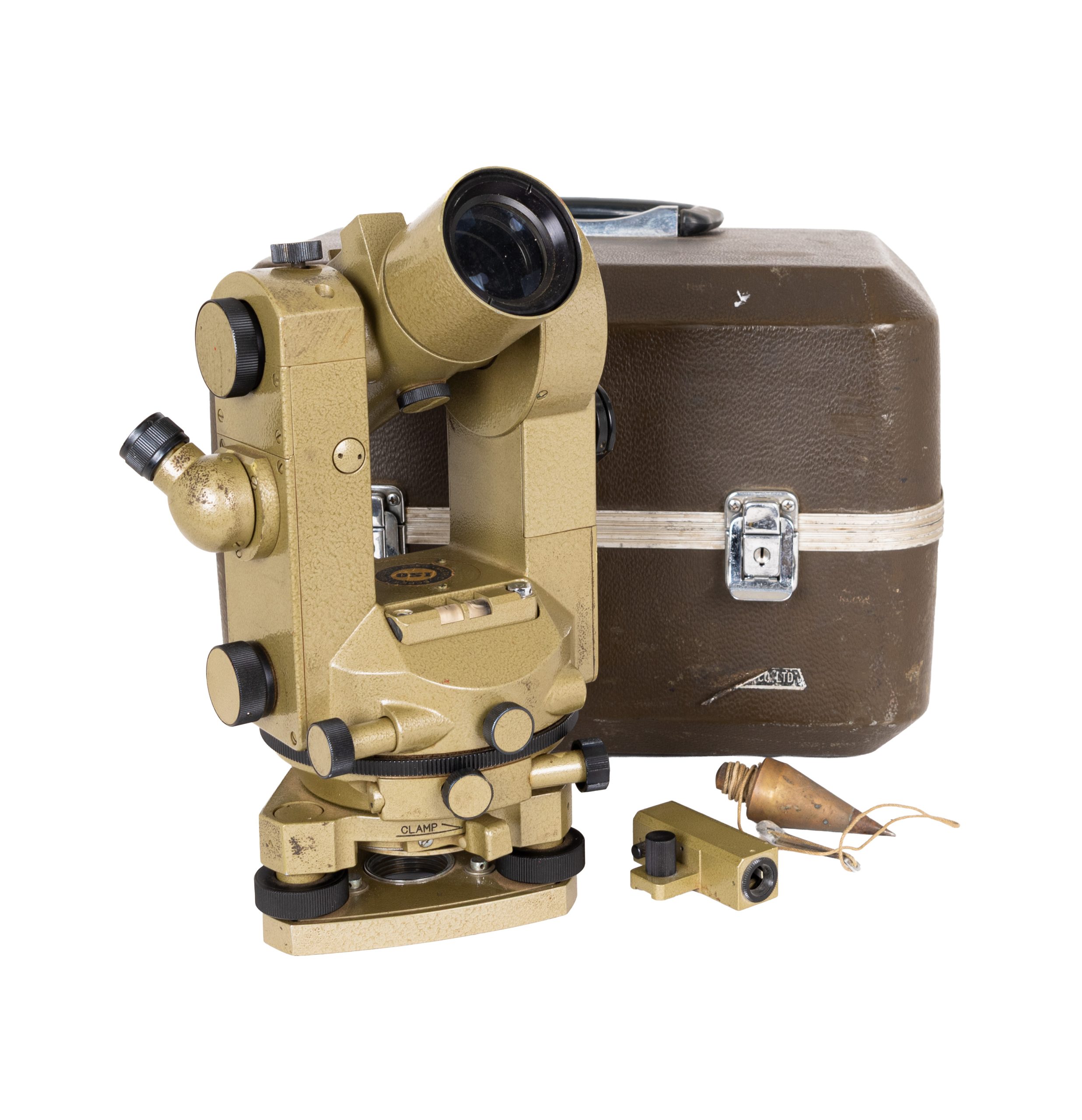 Teodolito de la manufactura Japonesa Fuji-Koh modelo T-301 en metal lacado en verde con tripode plegable en madera, segunda mitad del s.XIX. Se acompaña de maletín.