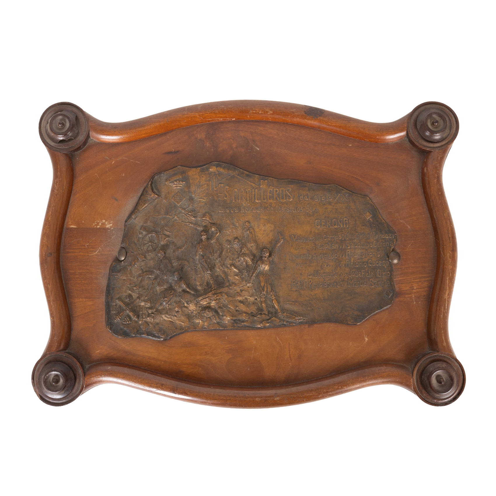 Placa conmemorativa en bronce sobre plafón de madera de los Arpilleros de Gerona del s.XX.