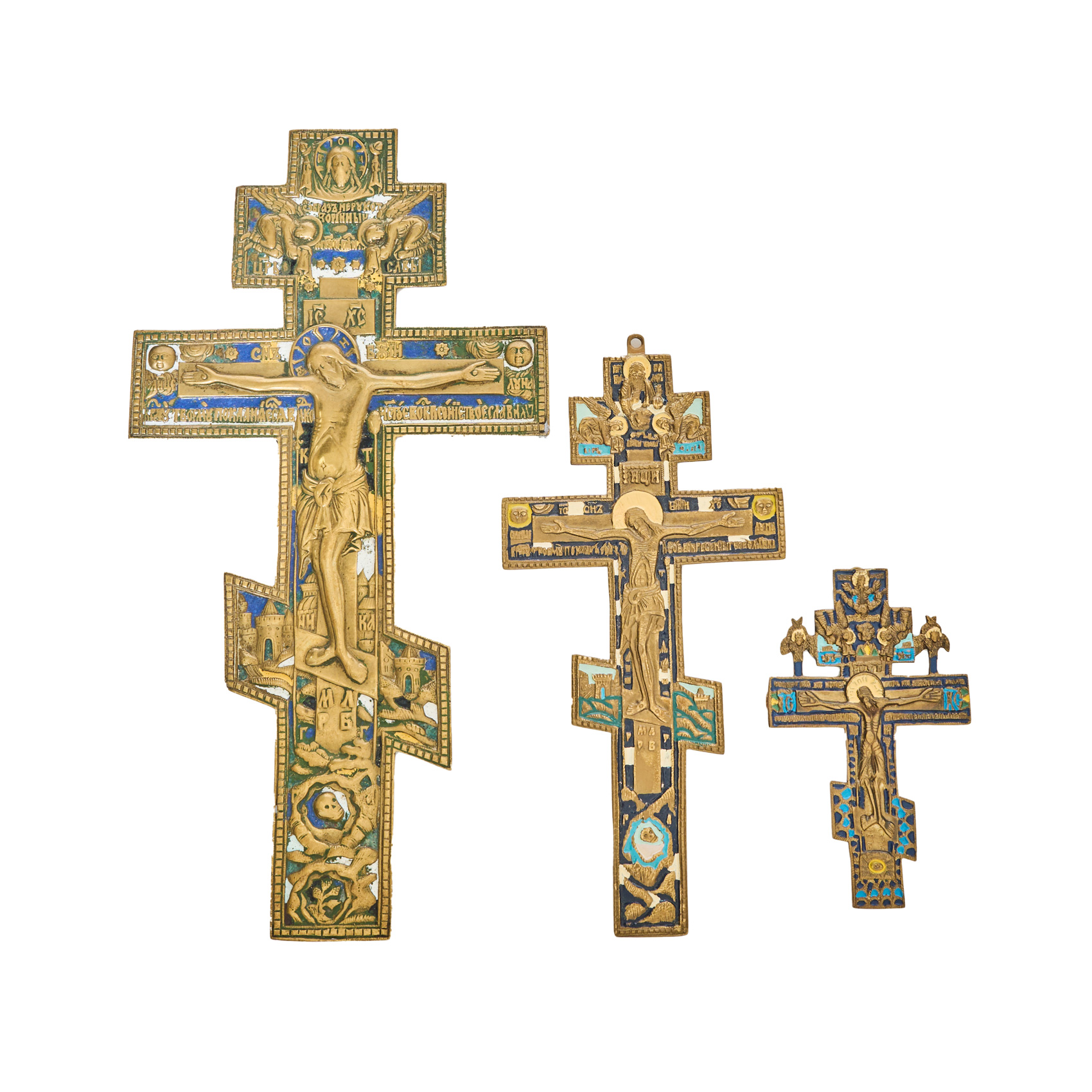 Lote de tres cruces ortodoxas rusas en bronce dorado y parcialmente esmaltado con representaciones de Cristo, Pantocrátor y Arcángeles, primera mitad del s.XX.