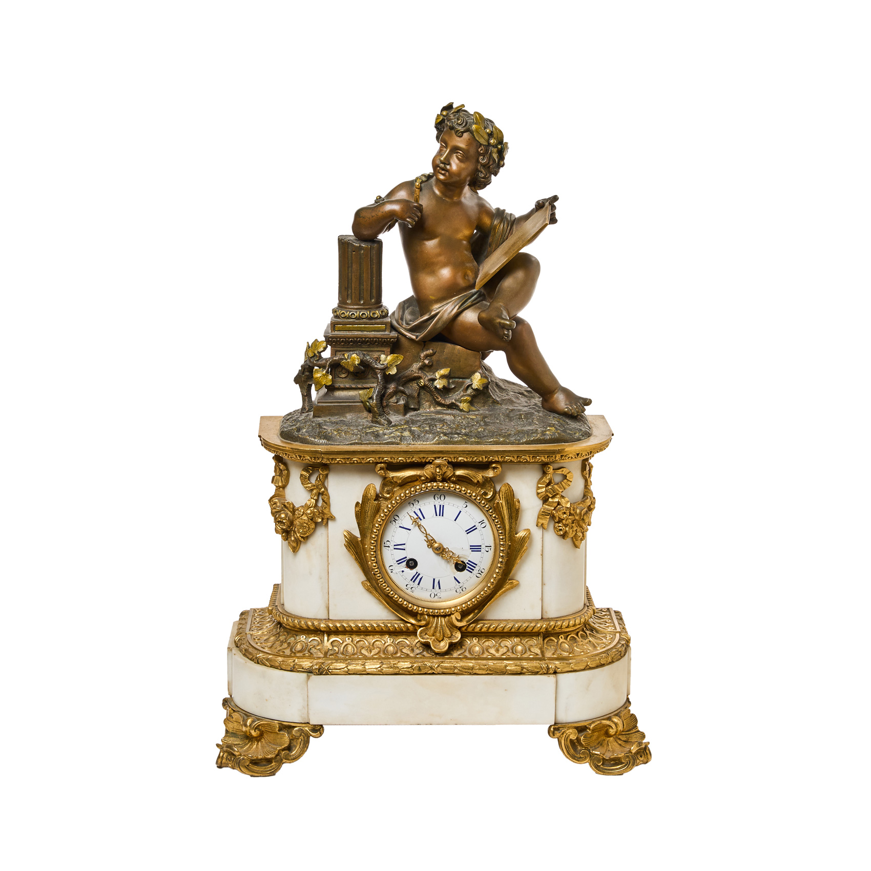Reloj de sobremesa francés estilo Luis XVI en mármol blanco y bronce dorado, fles. del s.XIX. Caja coronada por alegoria a la escritura en bronce patinado. Esfera con numeración romana con secundero arábigo. Maquinaria París con sonería de horas y medias. Sin péndulo. Sin llave.