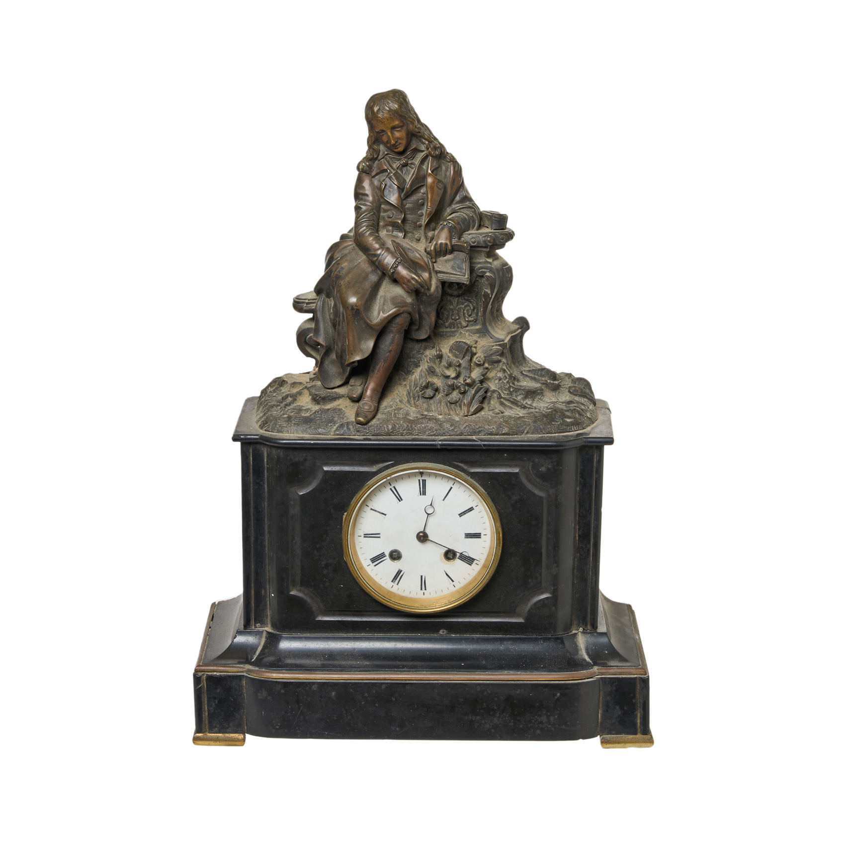 Reloj francés de sobremesa en bronce patinado y mármol negro coronado con representación de escritor. Esfera en porcelana esmaltada con numeración romana con sonería de horas y medias. Maquinaria París Japy Freres, c.1888.
