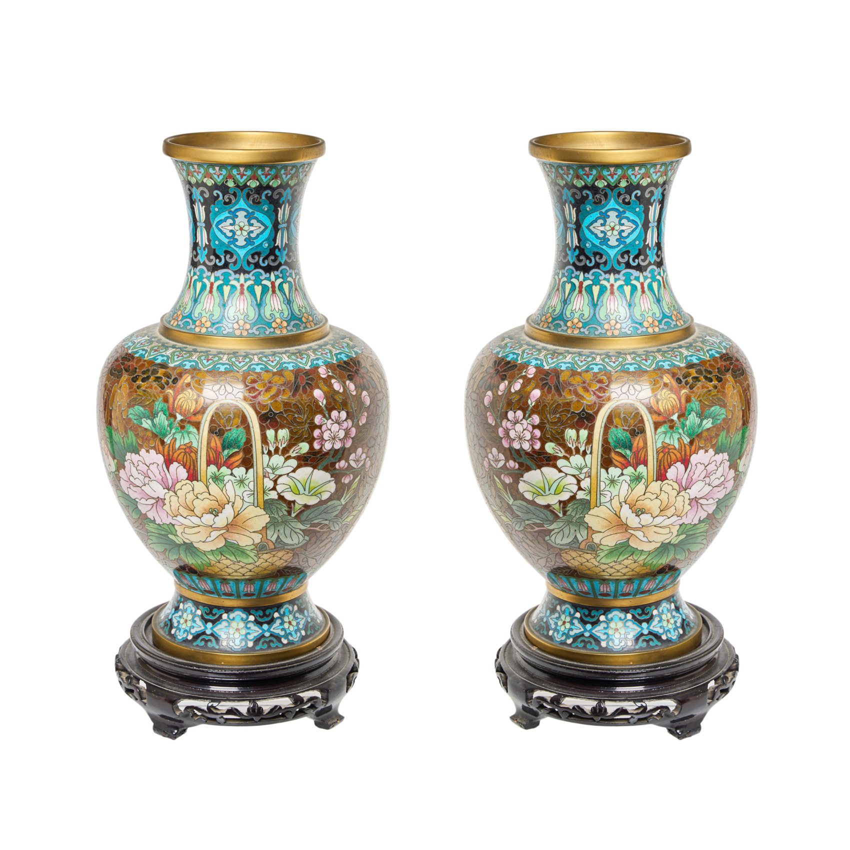 Pareja de jarrones chinos en esmalte cloisonné decorados por cestos florales y motivos geométricos, s.XX. Apoyan sobre peanas en madera frutal tallada.