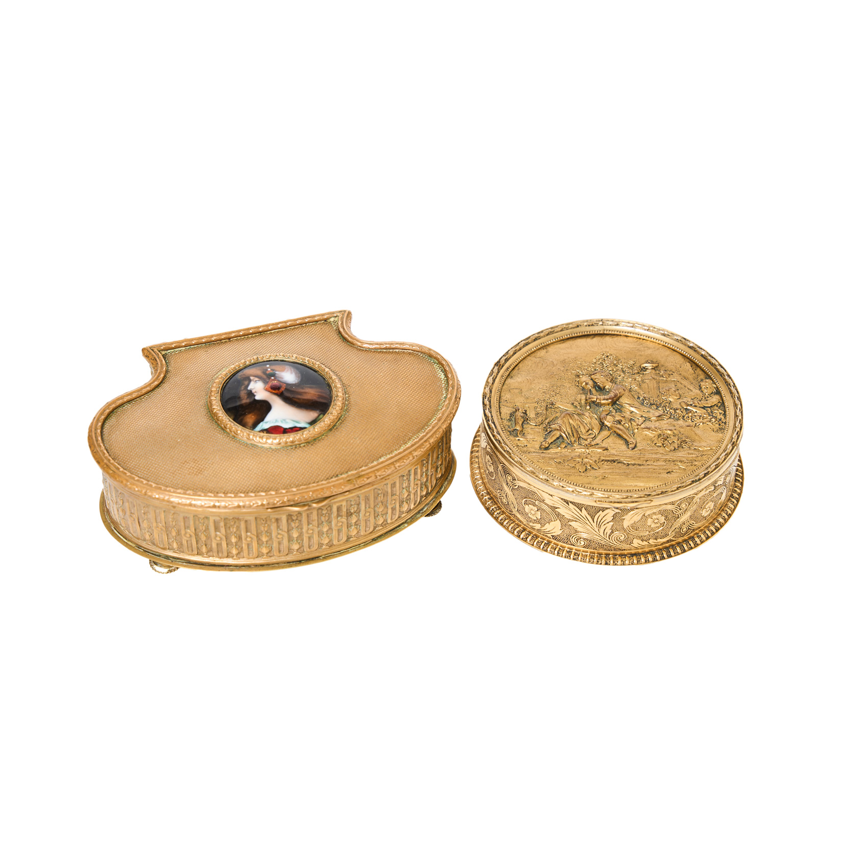 Pareja de cajitas en bronce y latón dorado, c.1900. Una con decoración de escena de cortejo en relieve y otra con esmalte de dama en la tapa.