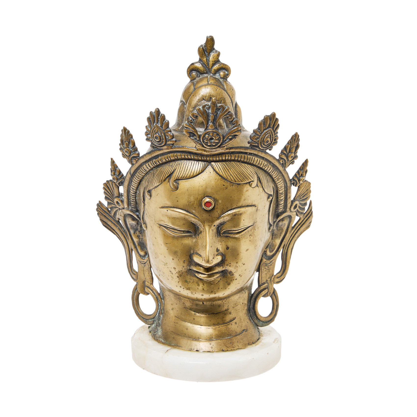 Cabeza de la diosa Tara en bronce dorado con pequeña incrustación de piedra en la frente, s.XX. Apoya sobre base en mármol blanco.