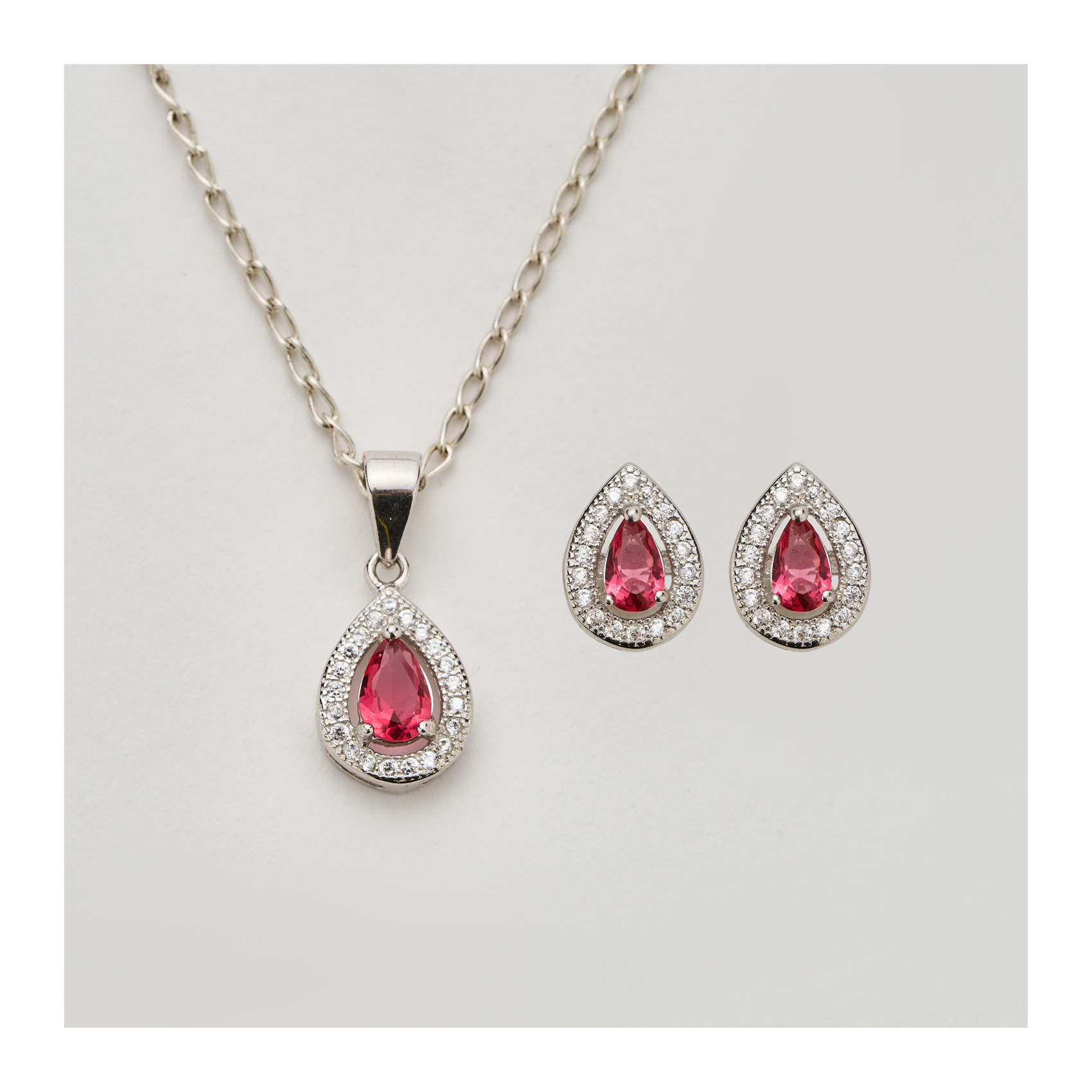 Juego de colgante y pendientes diseño lágrima en plata con símil de rubí talla perilla de 6 x 3 mm. y circonitas.