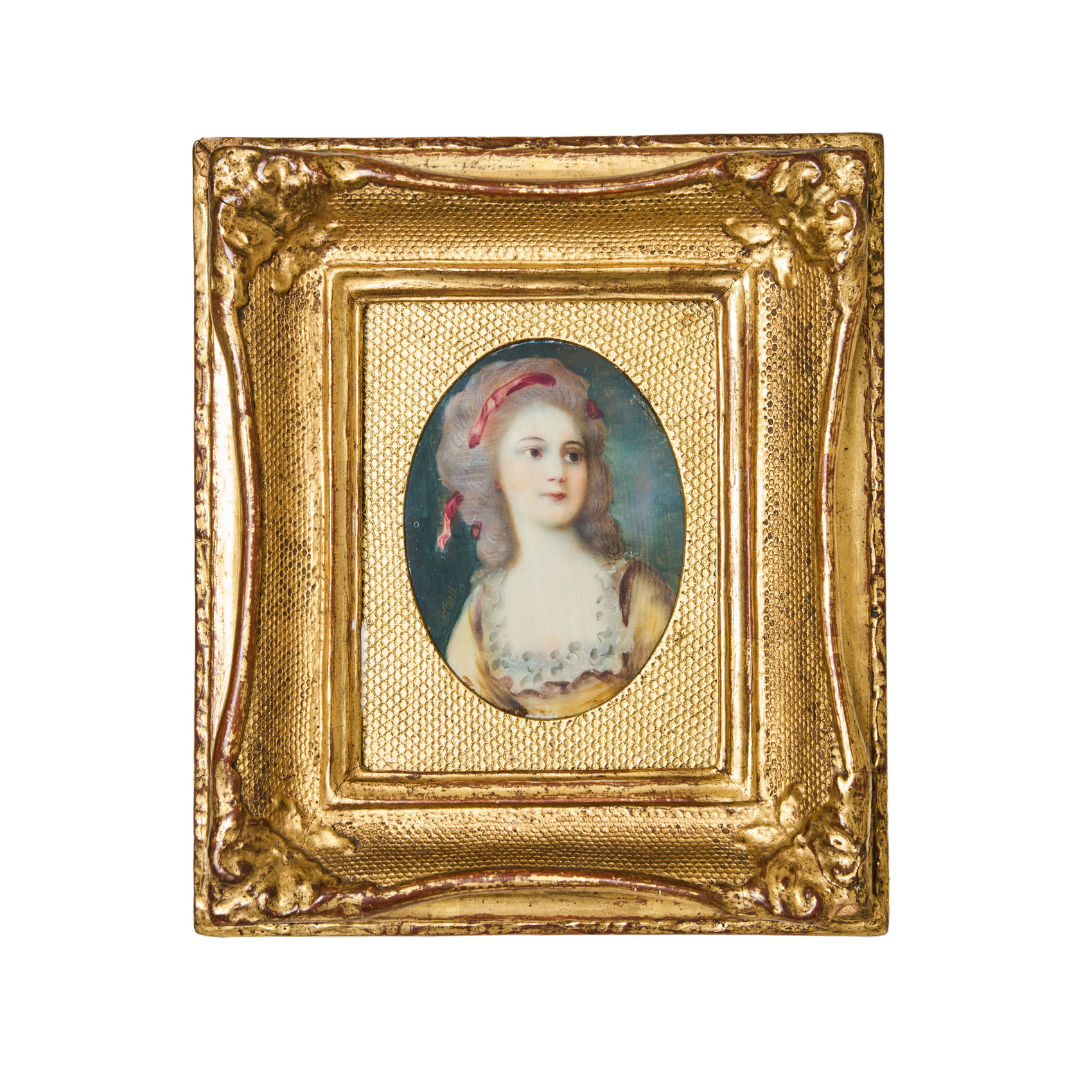 Miniatura pintada al gouache sobre placa en hueso con representación de retrato dama dieciochesca, s.XX. Firmada ViHall. Enmarcada.