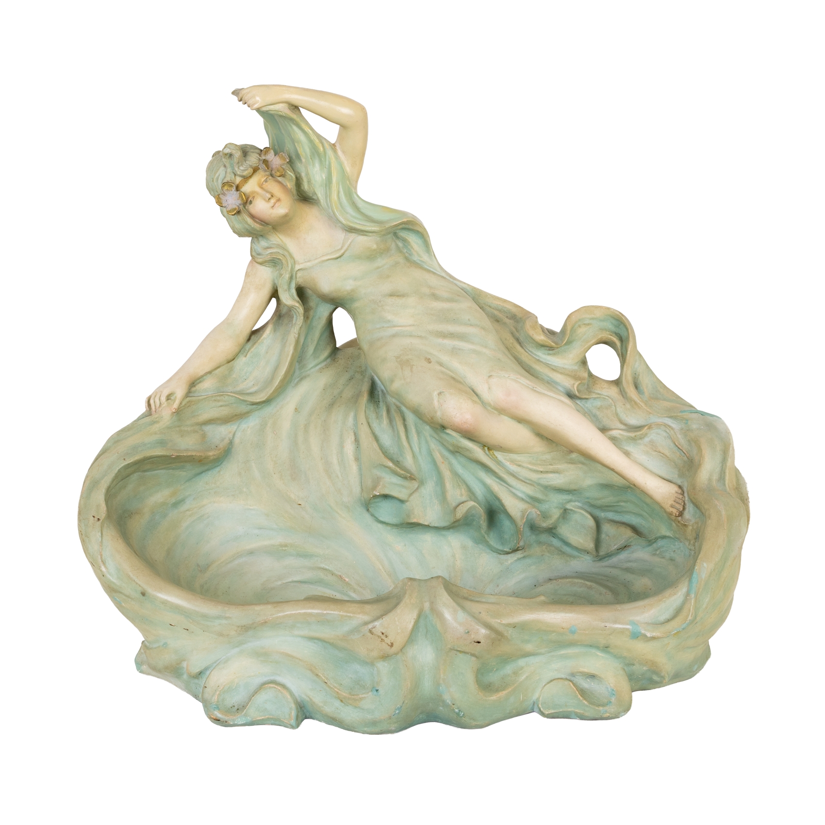 Centro modernista en estuco policromado con representación de Ninfa, c.1900. Presenta sello al dorso.