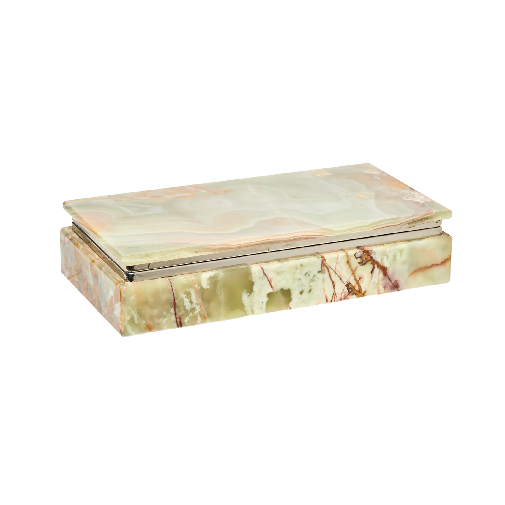 Caja tabaquera en ónix de tonalidad verde con montura en metal plateado, s.XX.