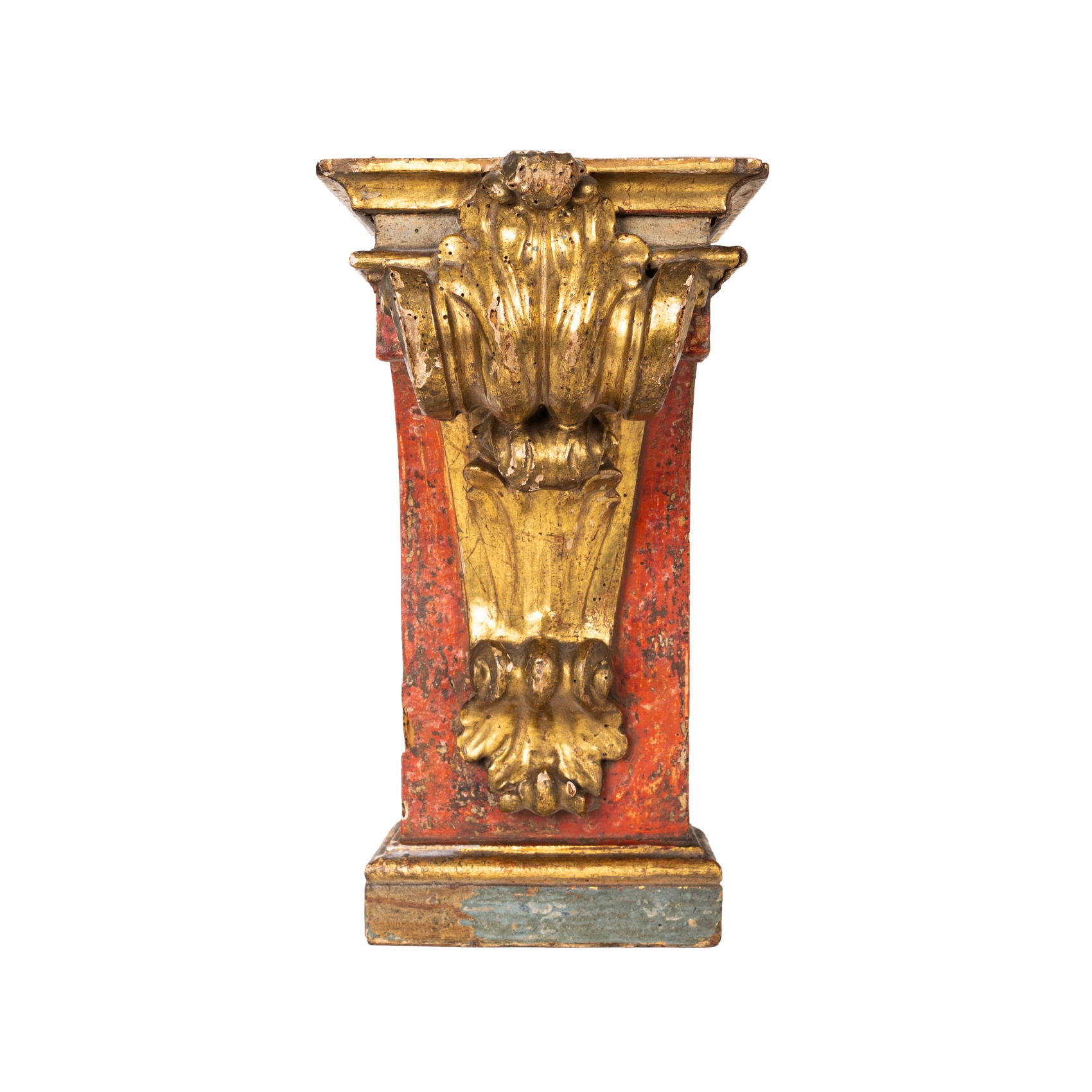 Ménsula de estilo barroco en madera tallada, policromada y dorada con decoración de volutas y acantos, s.XVIII.