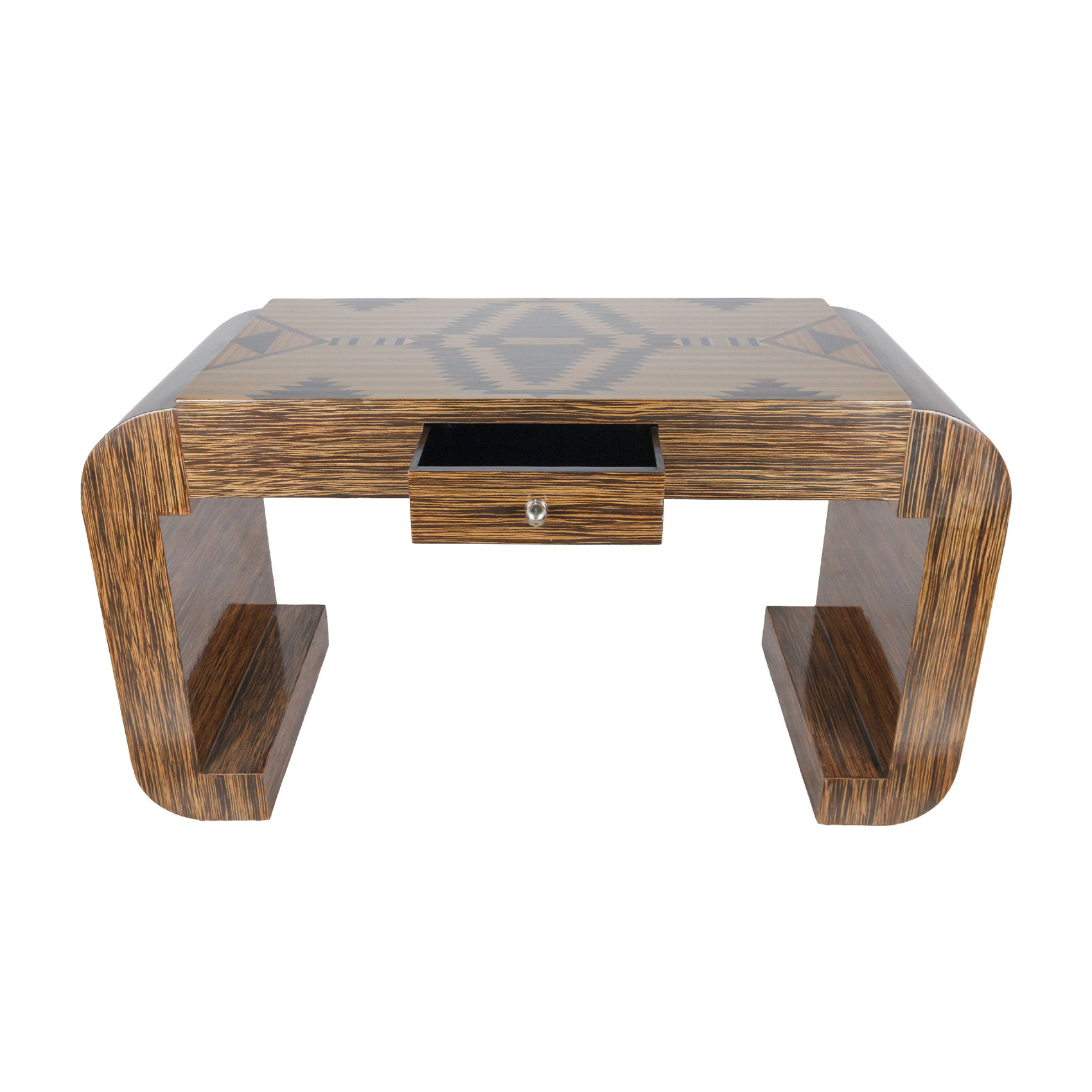 Escritorio Art Deco en madera chapada con diversos acabados, s.XX. Presenta pequeño cajón en cintura, patas curvas y tablero con estampado geométrico.