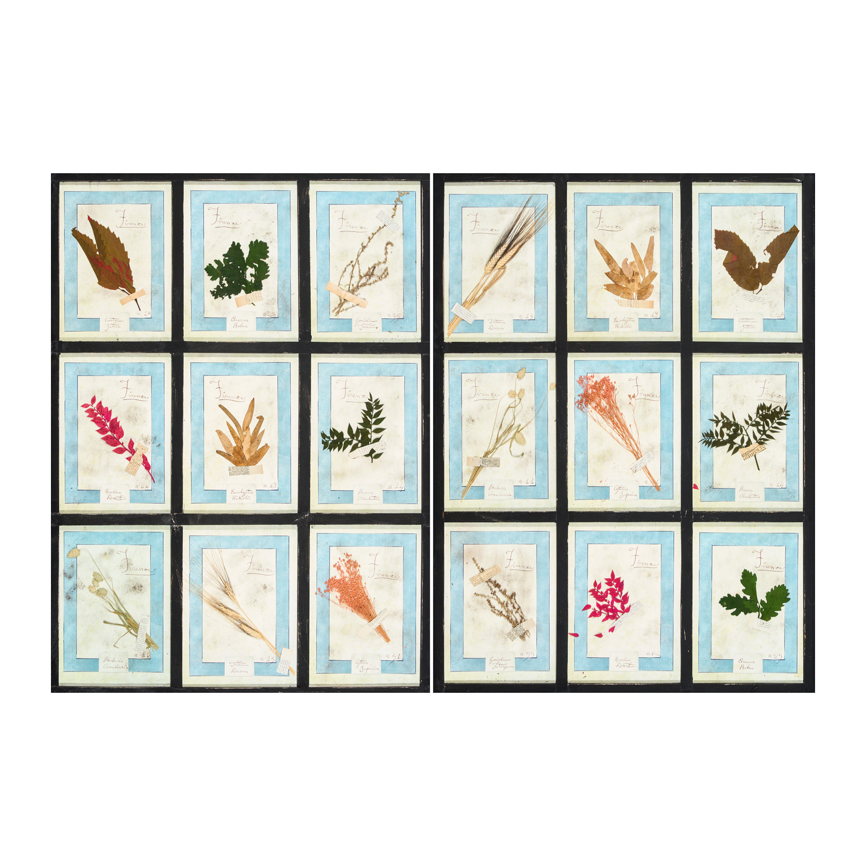Pareja de antiguos herbarios italianos de nueve celdas con diferentes tipos de hojas y flores, ppios. del s.XX.