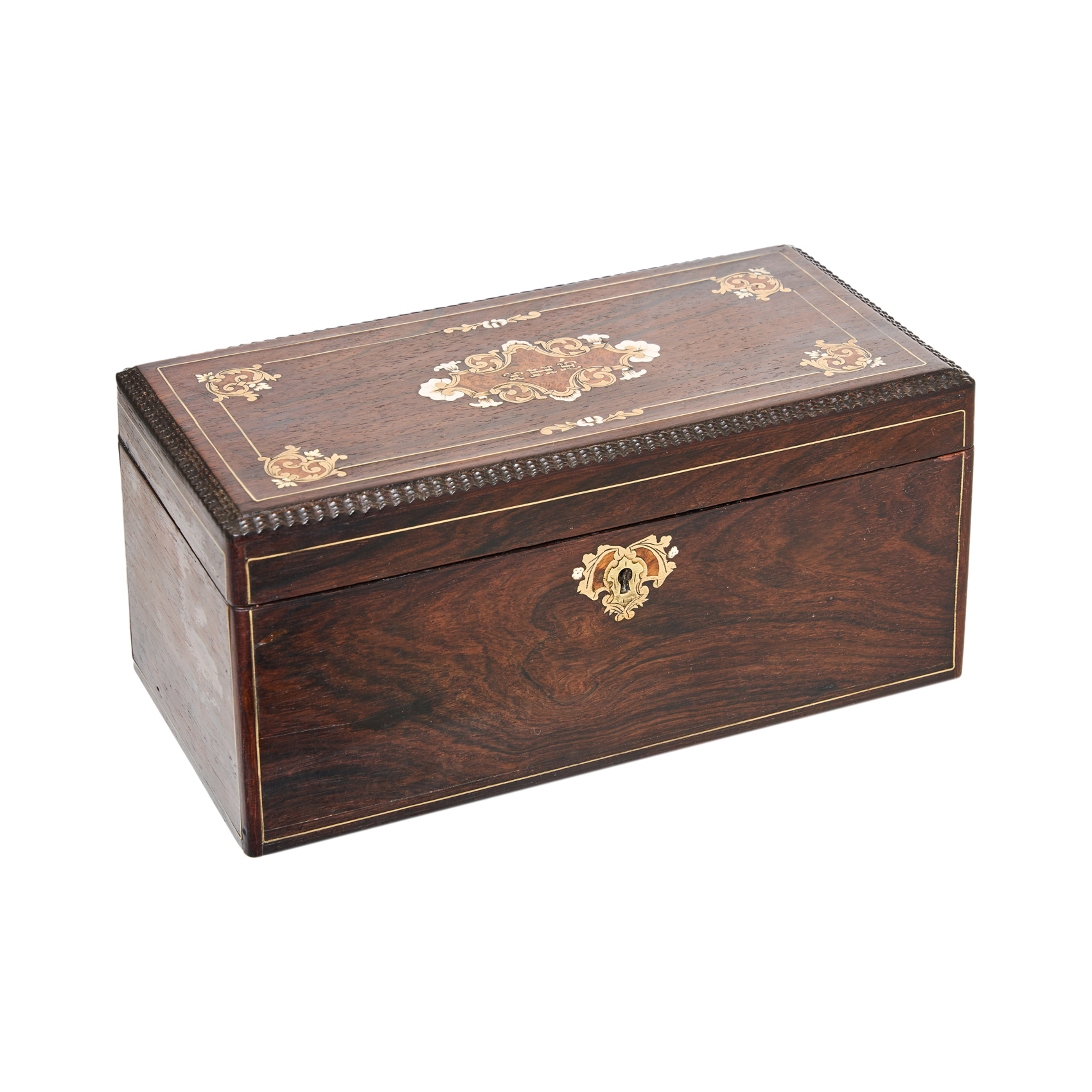 Caja para té francesa Napoleón III en madera tallada y marquetería en latón dorado con incrustaciones en hueso, fles. del s.XIX. Sin llave.