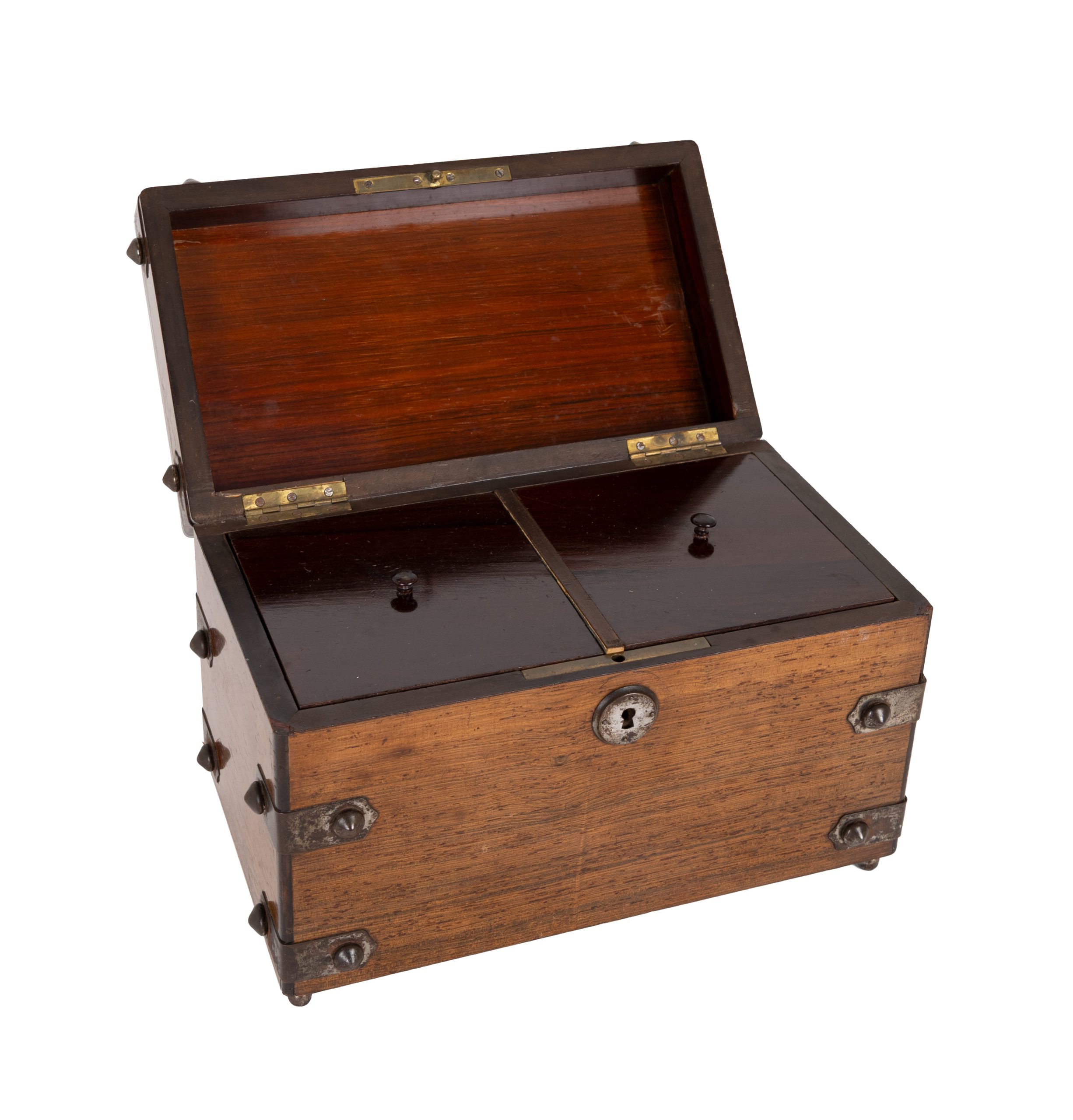 Caja para té o Tea Caddy en madera de palisandro con remates y cabujones en metal patinado, fles. del s.XIX. Adjunta llave.