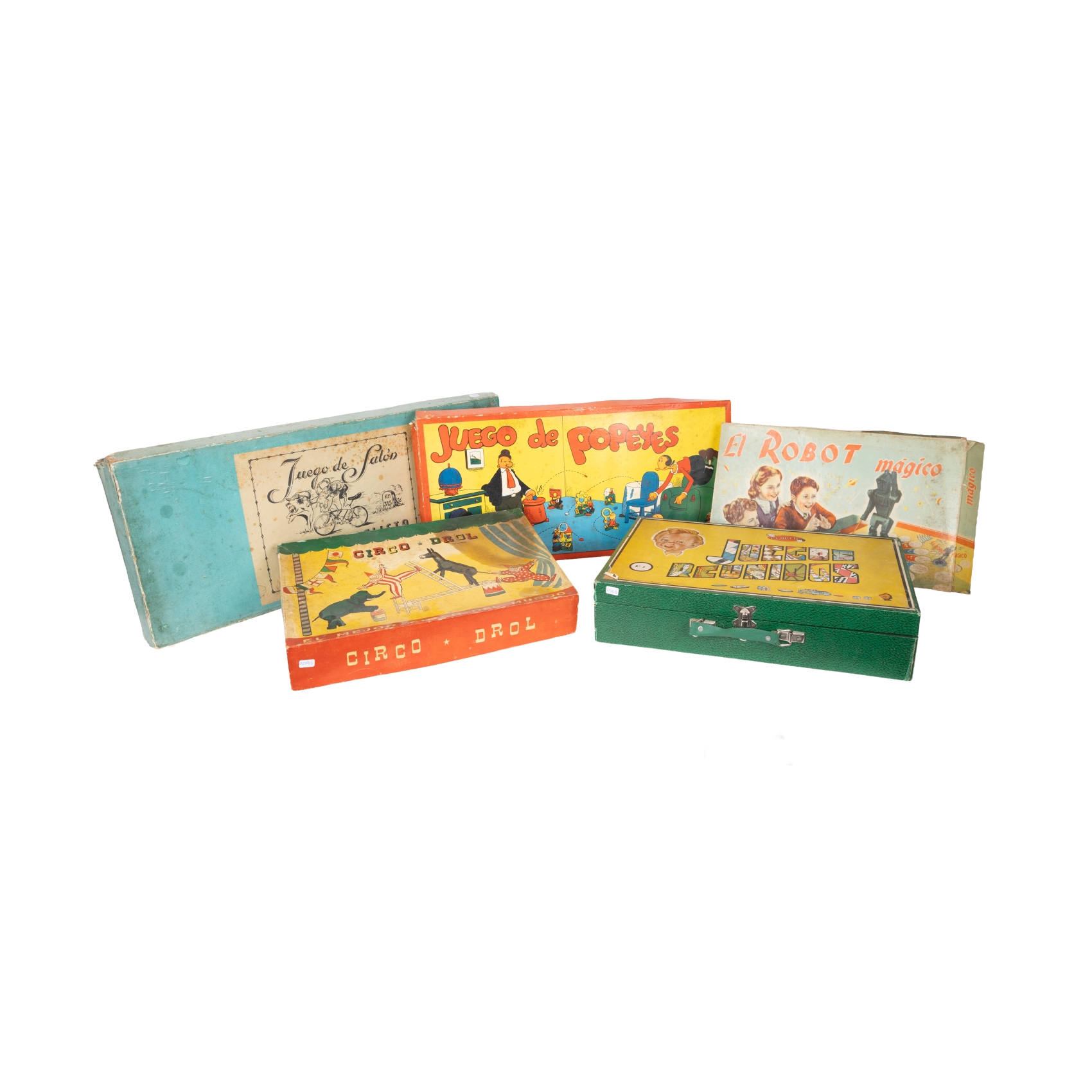 Lote de cinco juegos antiguos para niños, c.1950. Juegos reunidos Geiper, El Robot Mágico, Circo Drol, juego de Popeyes y Vuelta Ciclista España.