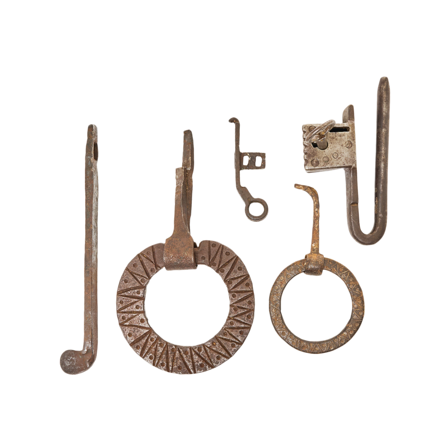 Lote de cuantro picaportes en hierro forjado, s.XVIII. Adjunta llave uno.