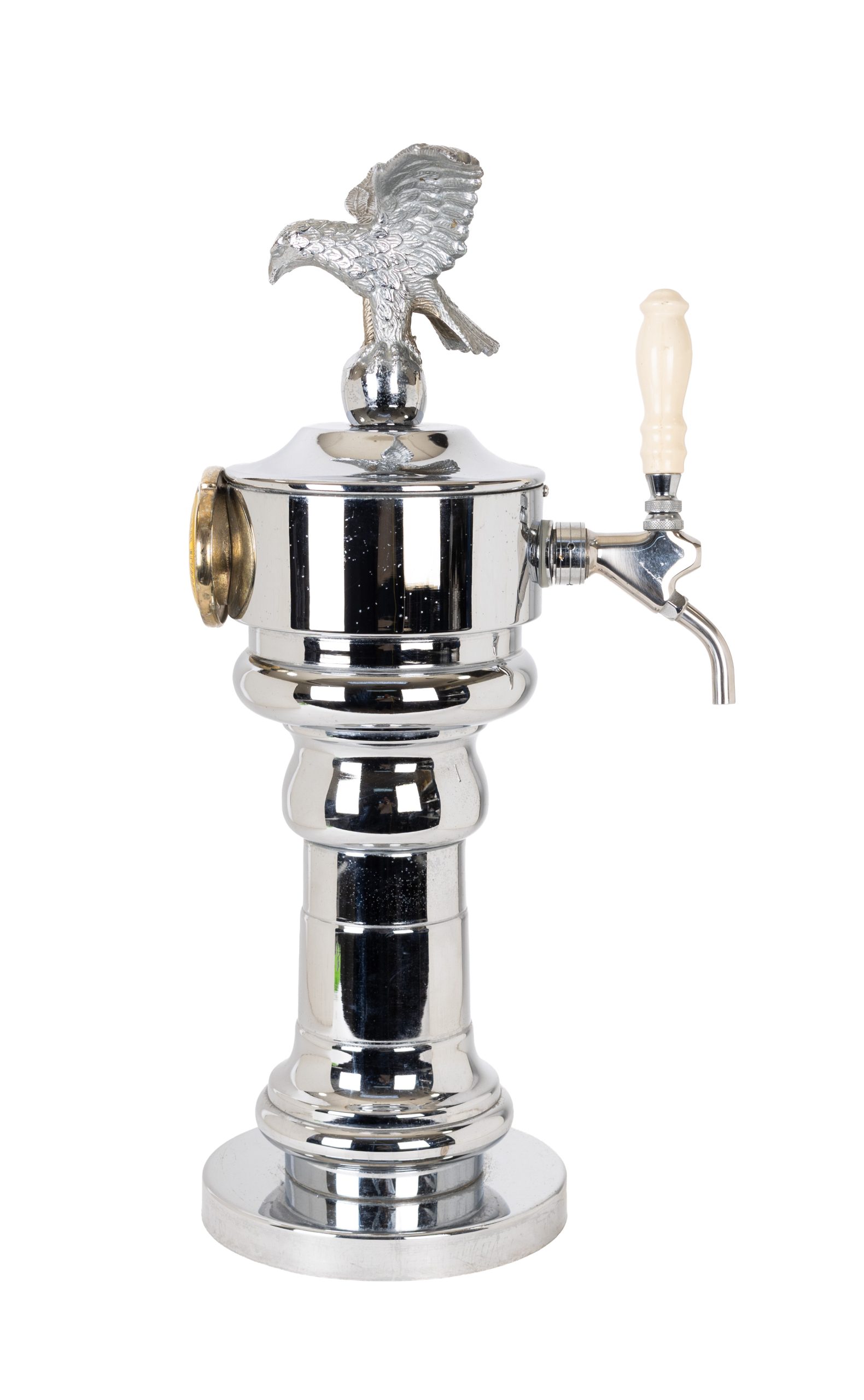 Surtidor de cerveza «El Aguila» en metal plateado. Placa frontal en pocelana esmaltada.