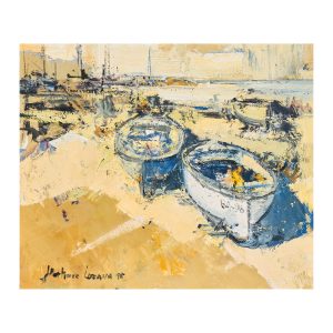 Hélice marina de cuatro palas 18 x 14 RH en bronce dorado de la manufactura Solé Diesel, numerada 18/97, s.XX. Adjunta soporte en madera.