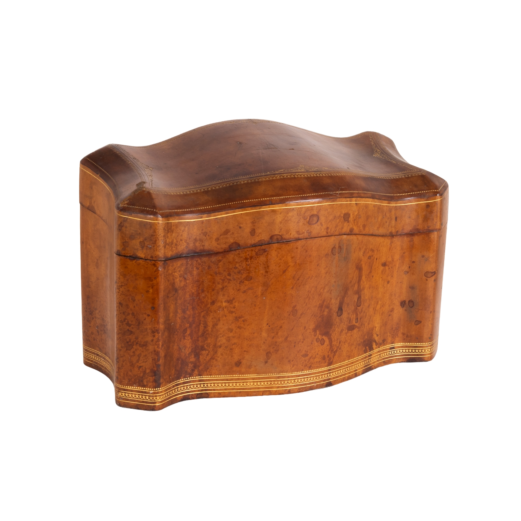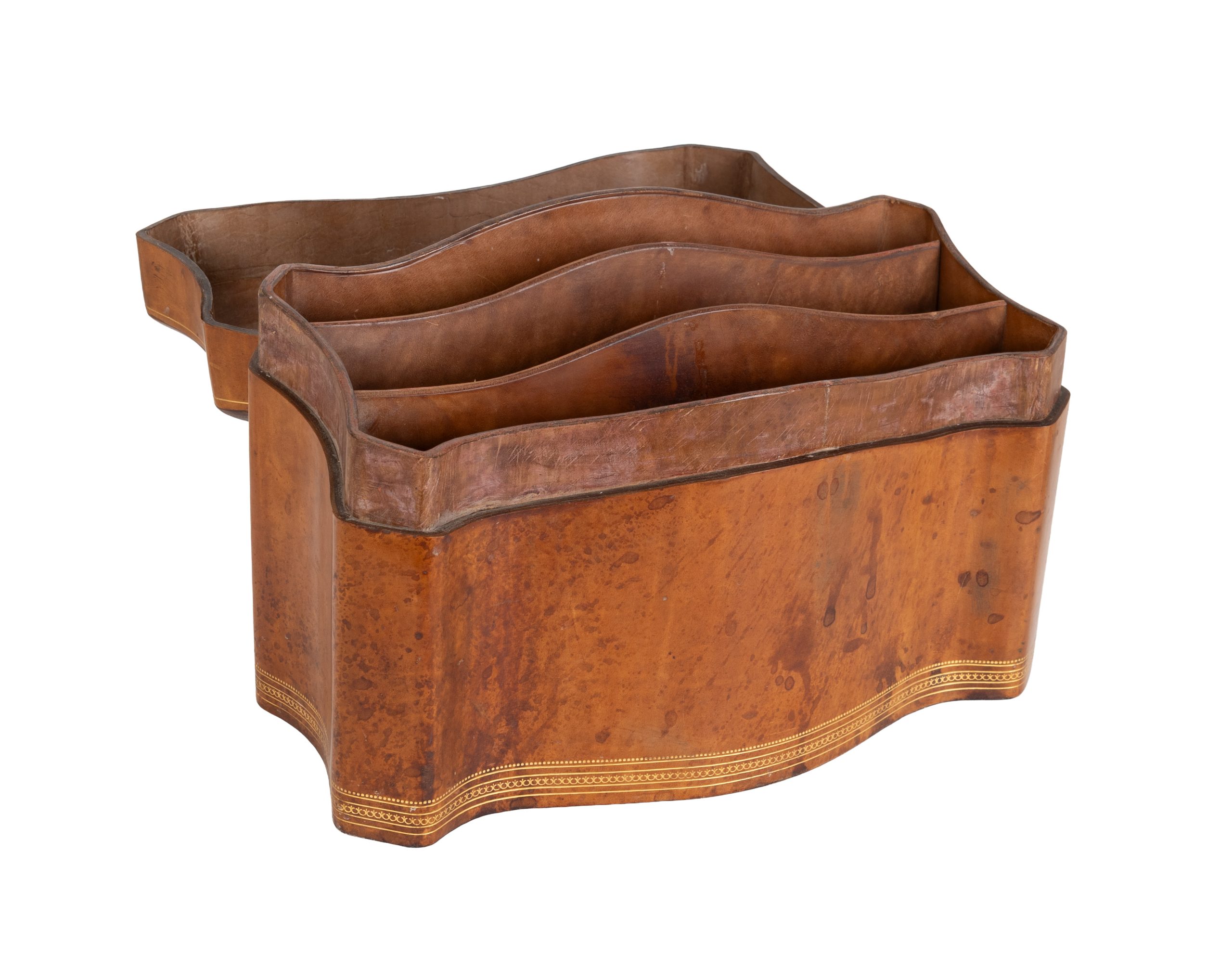 Caja para documentos inglesa en piel moldeada de tonalidad marrón con grabados perimetrales en dorado, s.XIX. Interior con tres compartimentos.