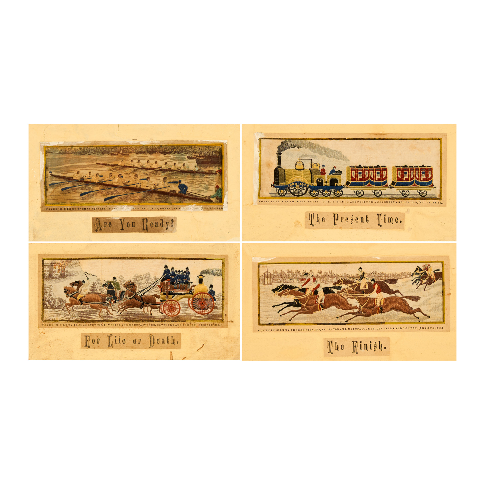 Lote de cuatro miniaturas bordadas en seda de diferentes escenas.