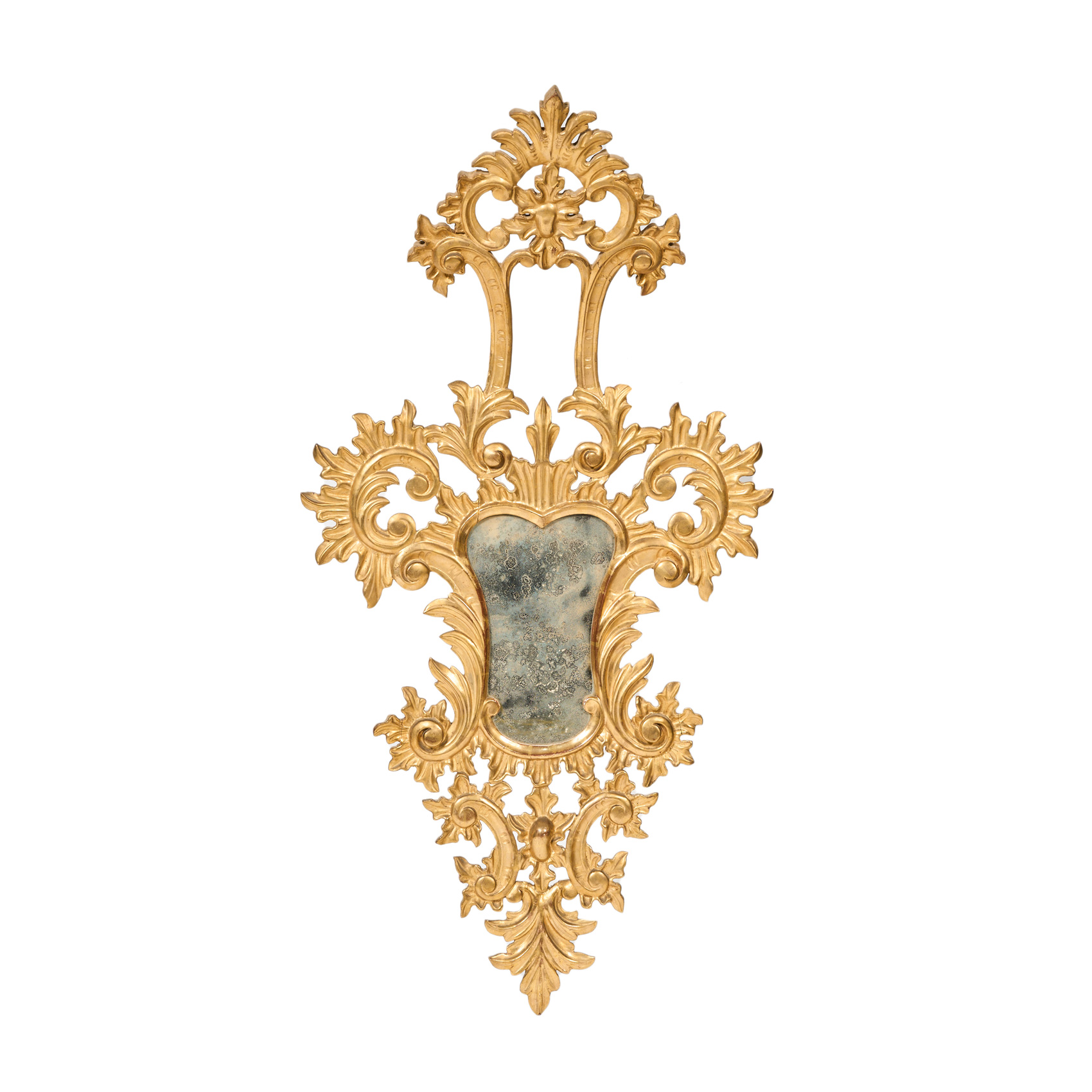Espejo cornucopia isabelina en madera dorada y tallada con profusa decoración vegetal de tornapuntas y rocallas, s.XIX.