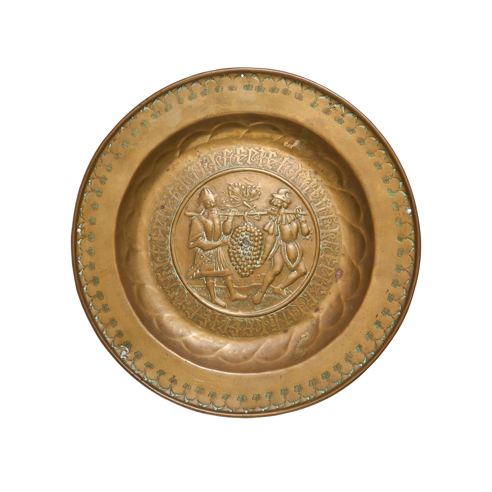 Plato petitorio de limosna en latón repujado con decoración central de escena con los espías de Canaan, Josua y Caleb portando las uvas custodiada por cenefa con letras góticas, Núremberg, Alemania s.XVI-XVII.