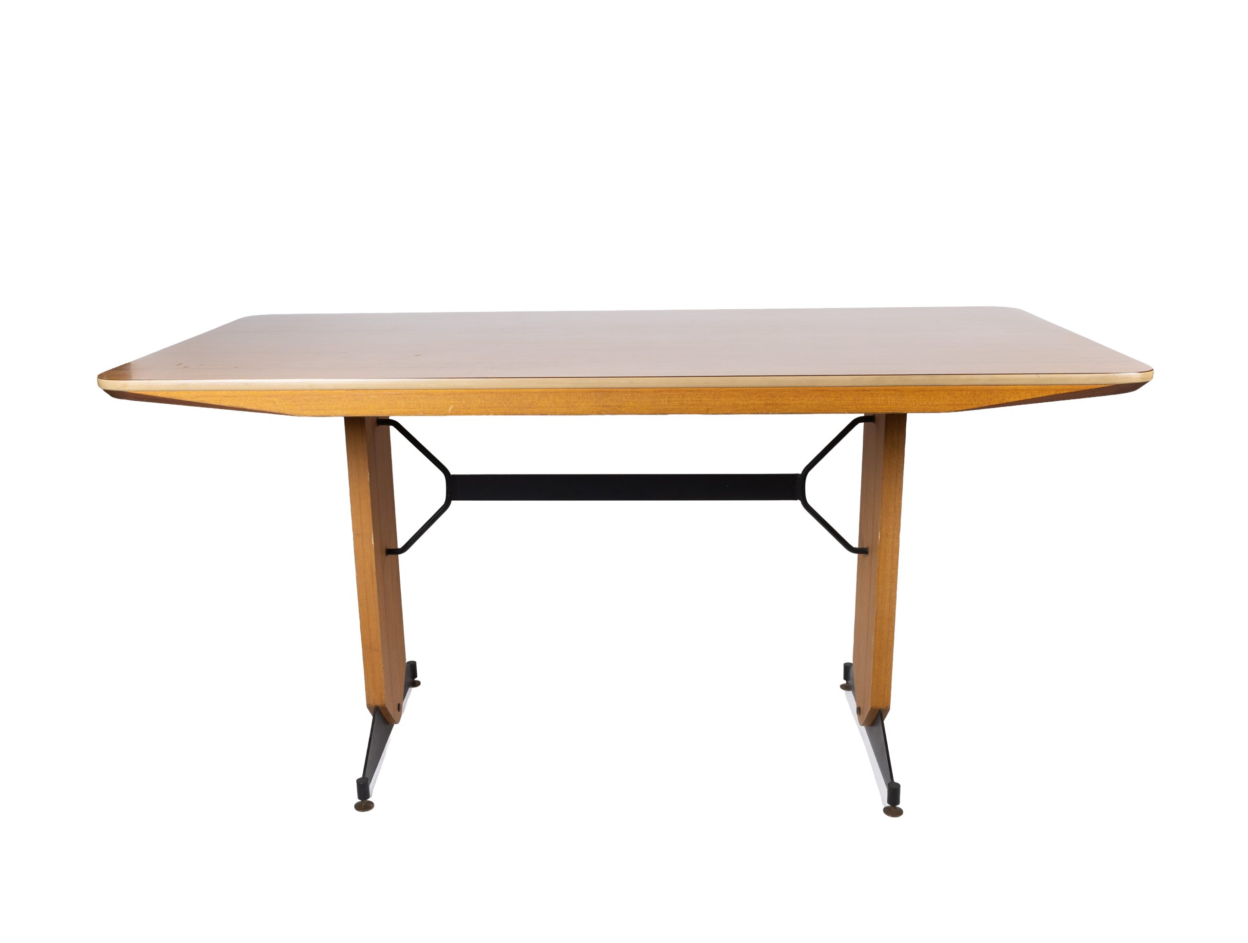 Juego de comedor compuesto por mesa y seis sillas en madera chapada y curvada con asientos en símil cuero rosado, c.1950. Patas en metal lacado en negro.