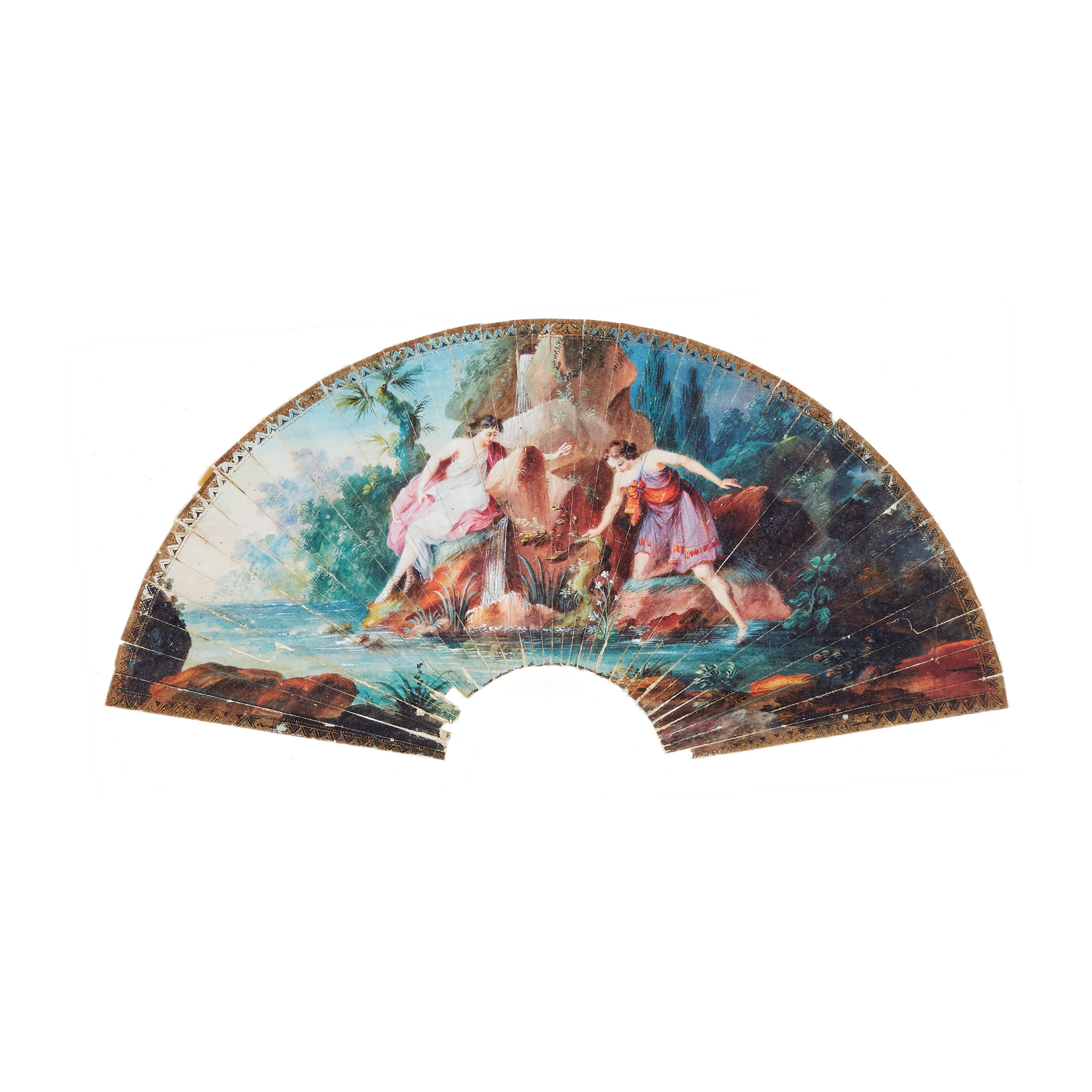 País de abanico francés pintado al gouache sobre papel con decoración de escena mitológica, s.XVIII. Enmarcado.