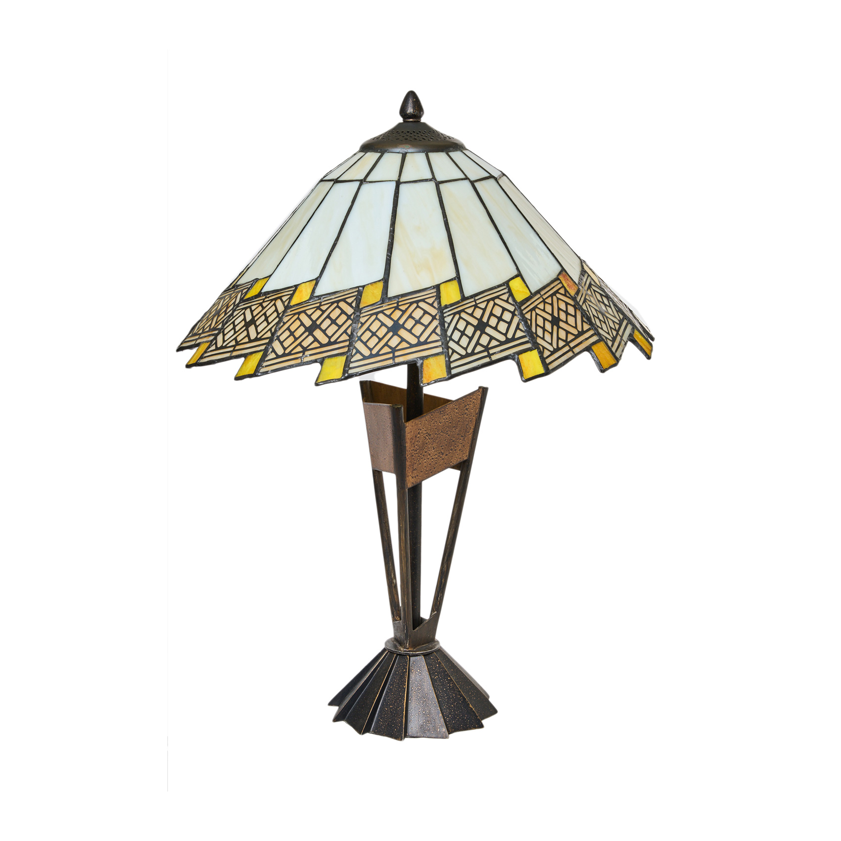 Lámpara de sobremesa en metal patinado de formas geormétricas con pantalla emplomada en pasta de vidrio de tonalidades crema y amarillas, s.XX.