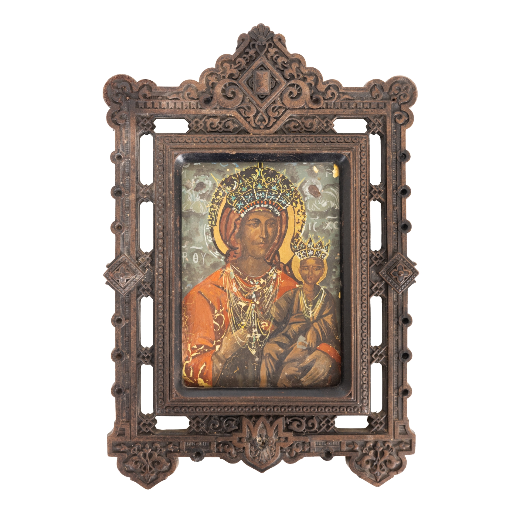 Miniatura pintada sobre cobre con representación de la Virgen Negra de Czestochowa, patrona de Polonia, fles. del s.XIX. Presentada con marco en madera tallada y calada.