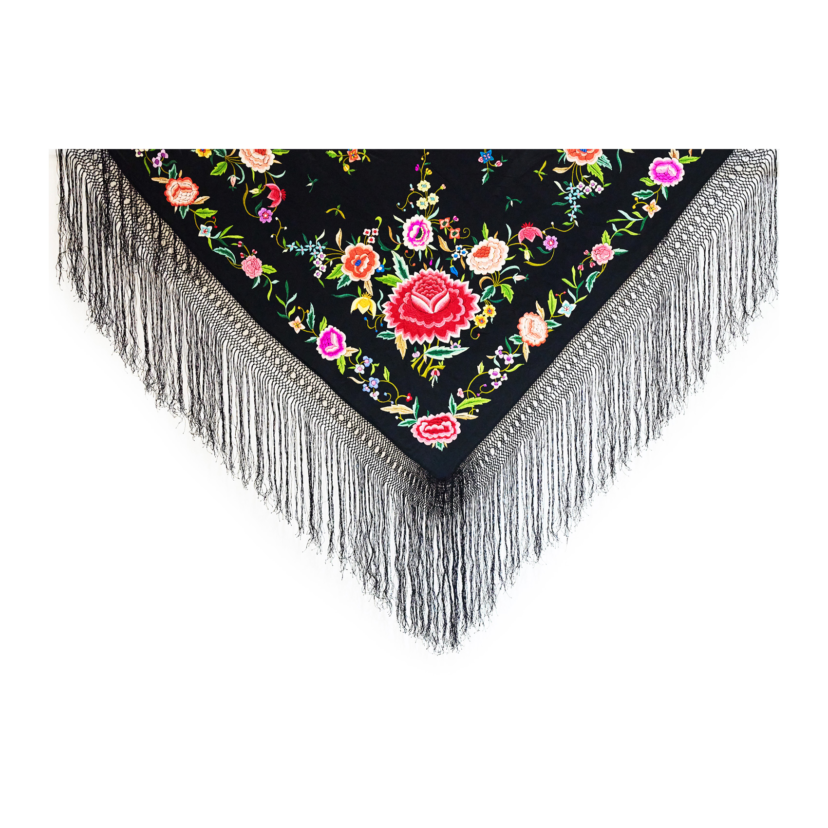 Mantón de Manila en seda de tonalidad negra bordada a mano con decoraciones florales en varias tonalidades, s.XX.