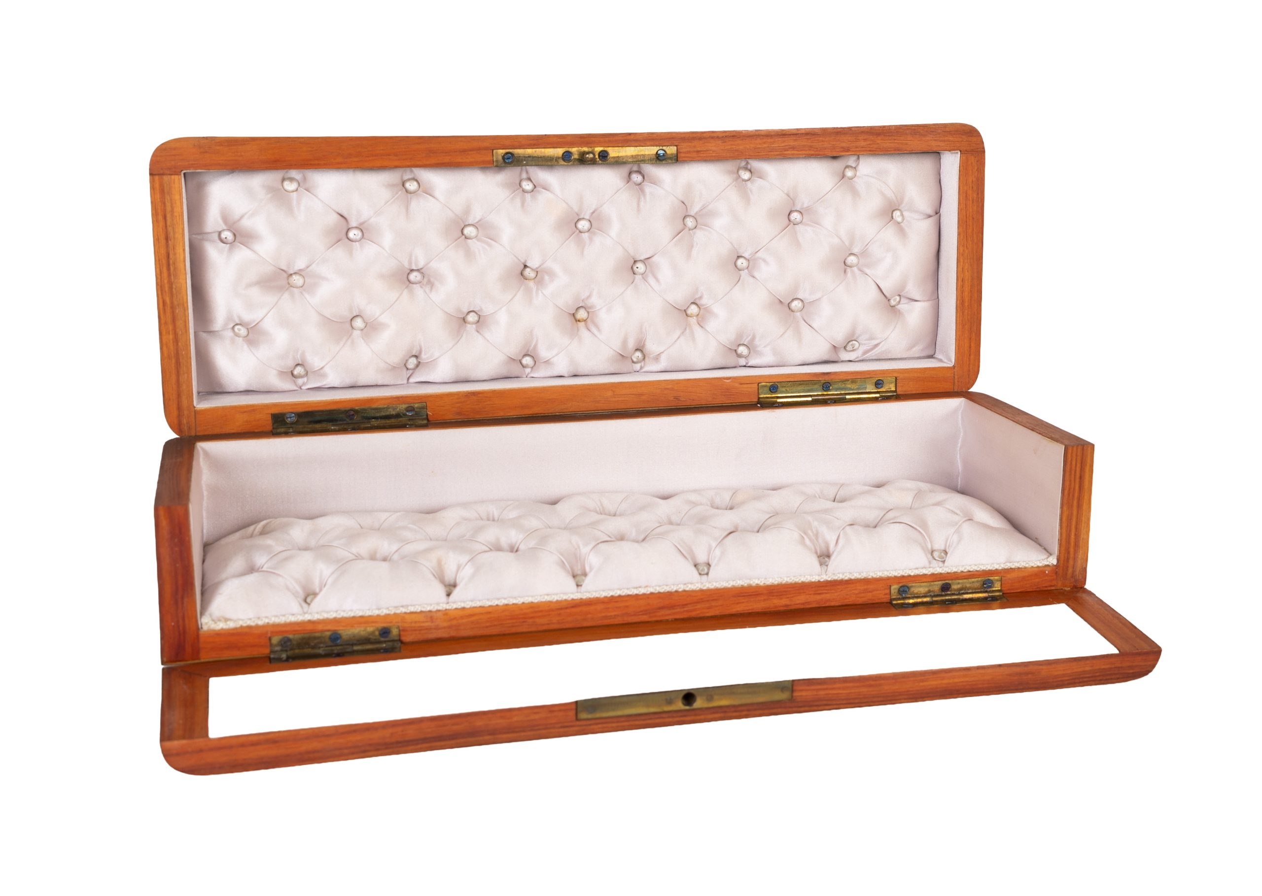 Caja joyero francesa Napoleon III en madera de fresno y palo rosa, segunda mitad del s.XX. Interior tapizado en capitoné. Adjunta llave.