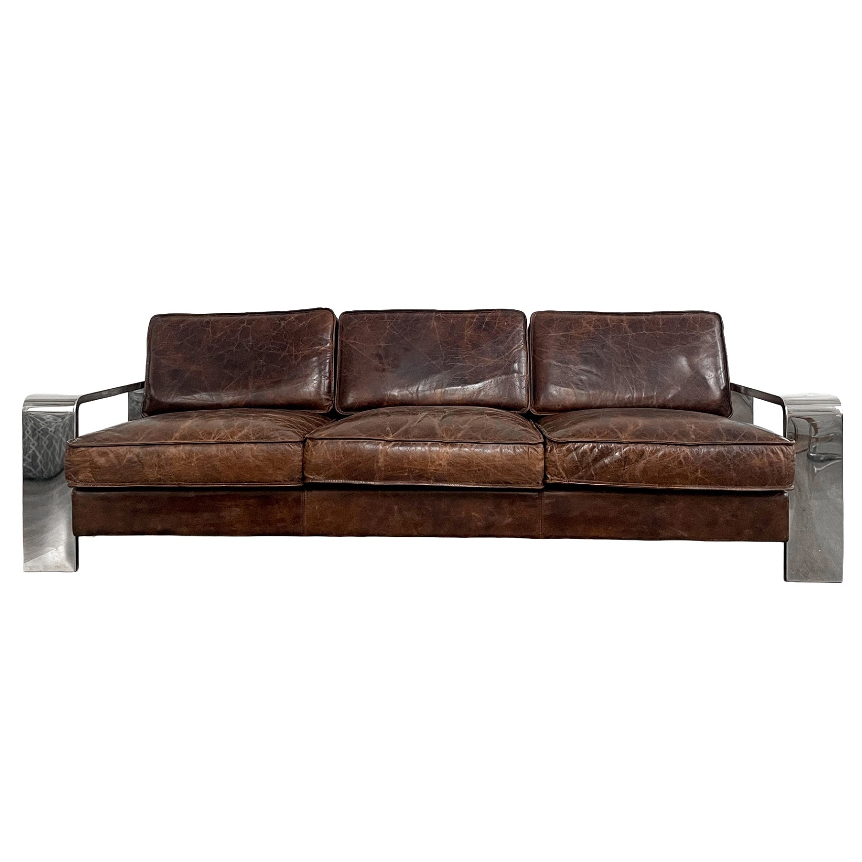 Espectacular sofá de tres plazas en cuero de tonalidad marrón con estructura y brazos en metal cromado, que a su vez sirven por la parte exterior a modo de repisas para decoraciones, libros o revistas.