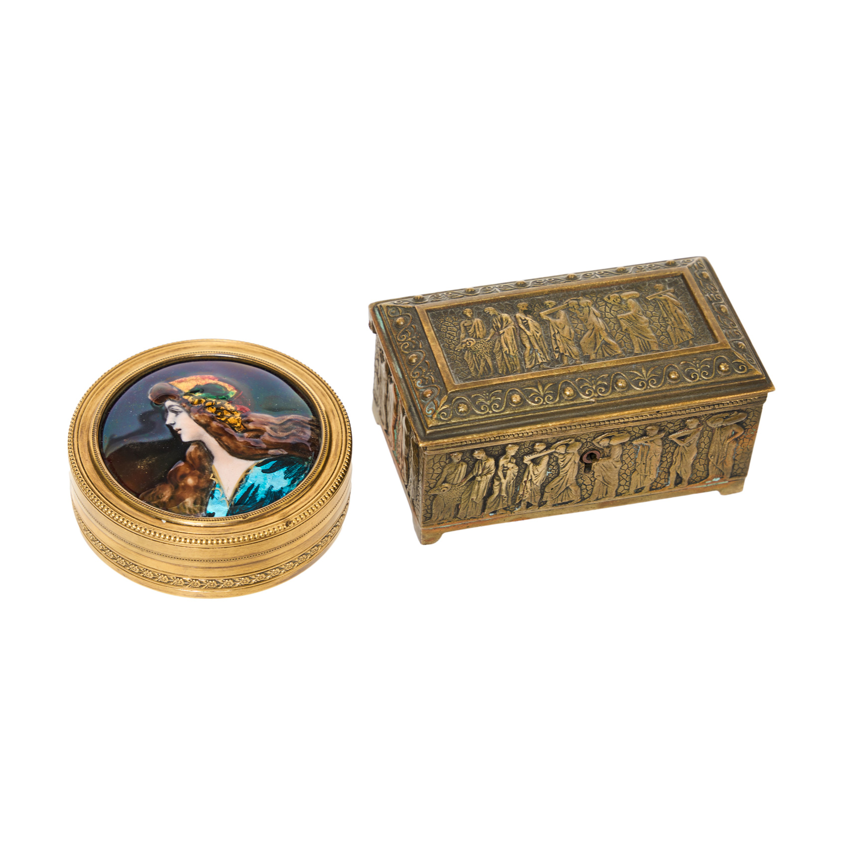 Pareja de cajitas en bronce y latón dorado, s.XX. Una Art Deco con decoración de damas clásicas en relieve y otra con esmalte de dama en la tapa. Sin llave.
