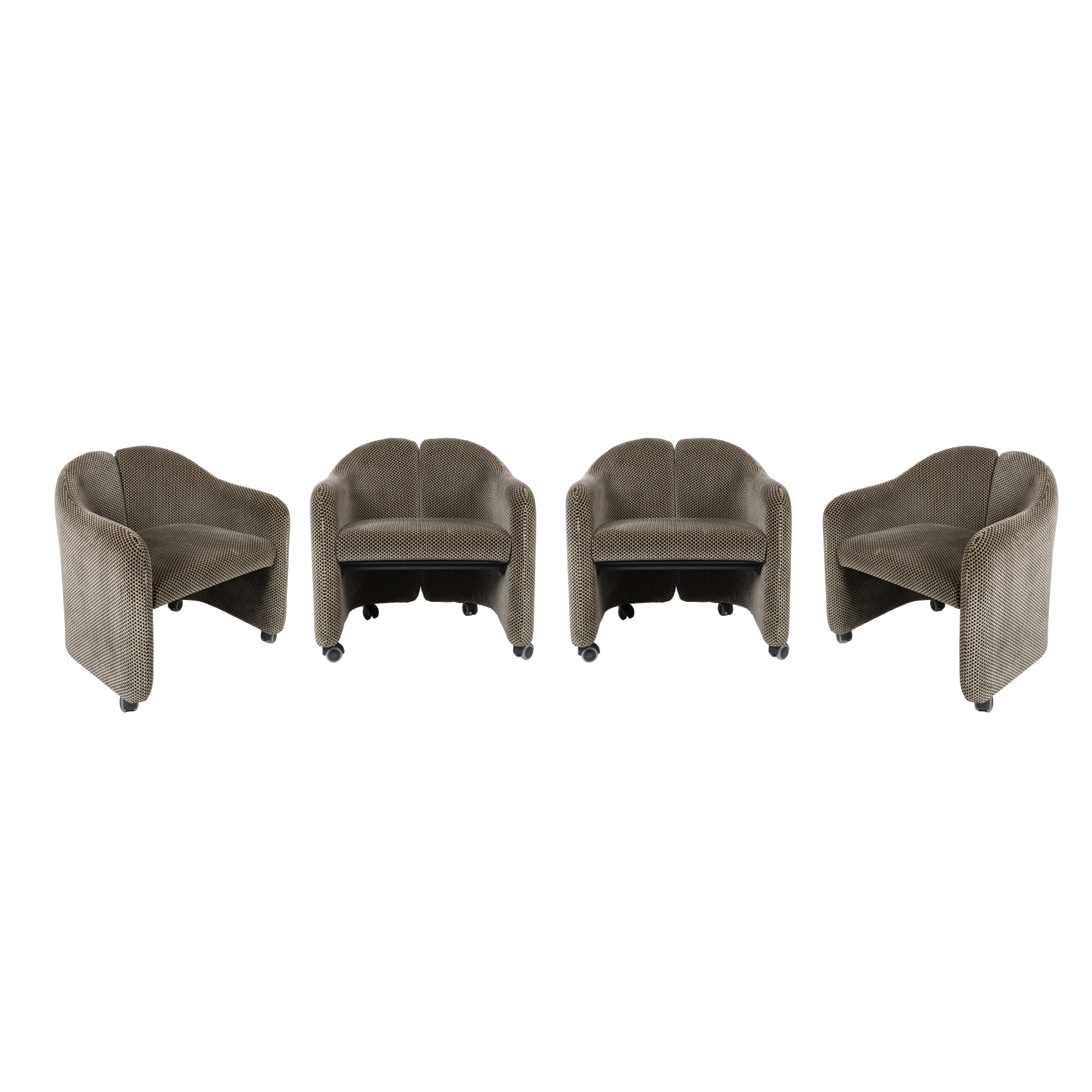 Juego de cuatro butacas de comedor modelo «PS142» con tapicería geométrica en terciopelo verde y negro. Rematadas por ruedines.