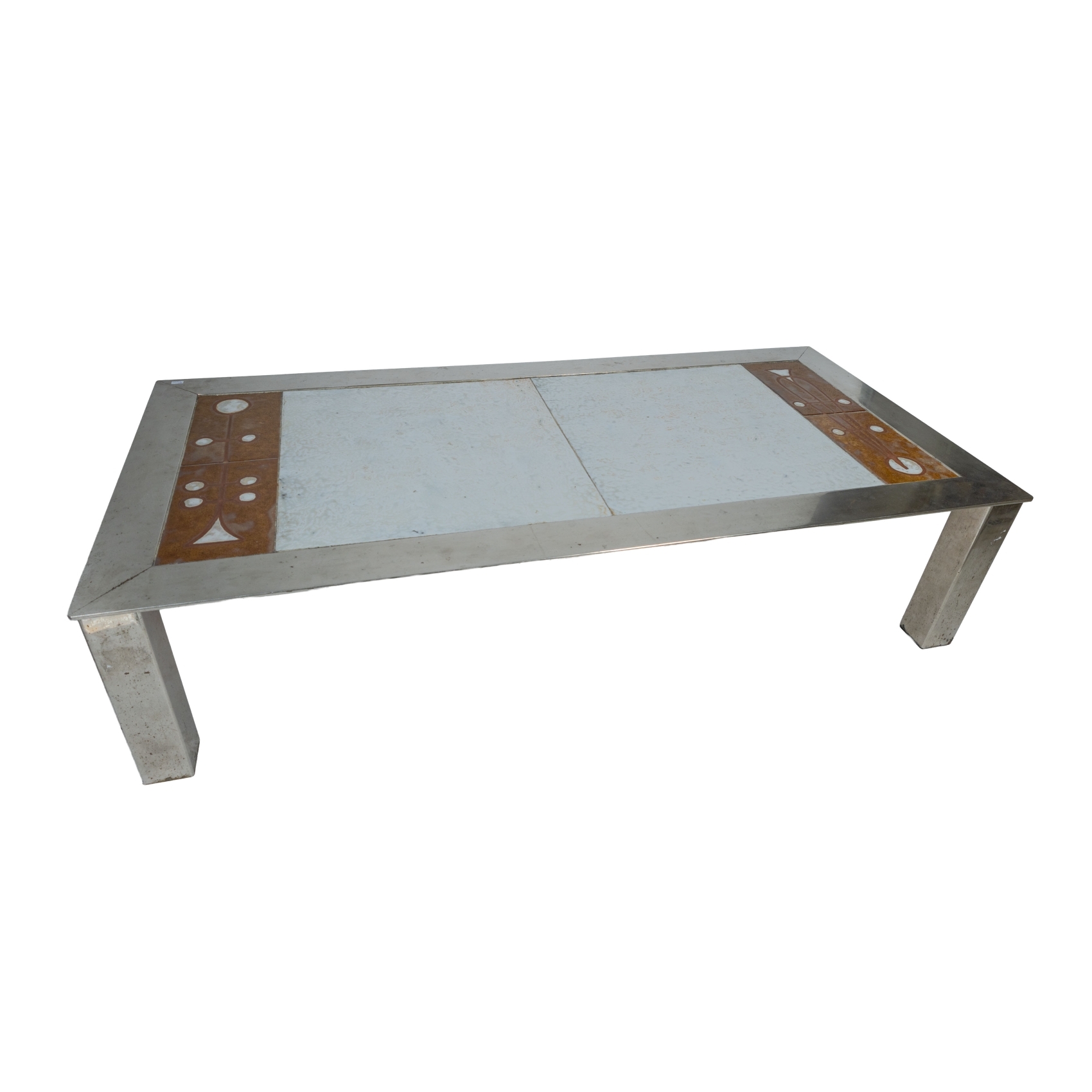 Mesa baja con estructura metálica en acero inoxidable y sobre en cerámica esmaltada.