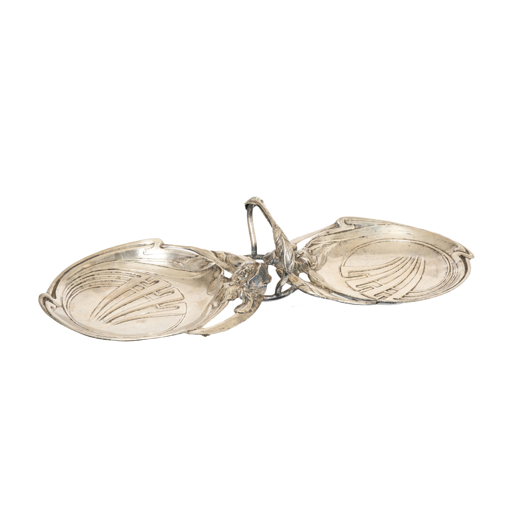 Centro de mesa modernista de dos bandejas en estaño con decoración de estilo Art Nouveau, c.1900-1910.