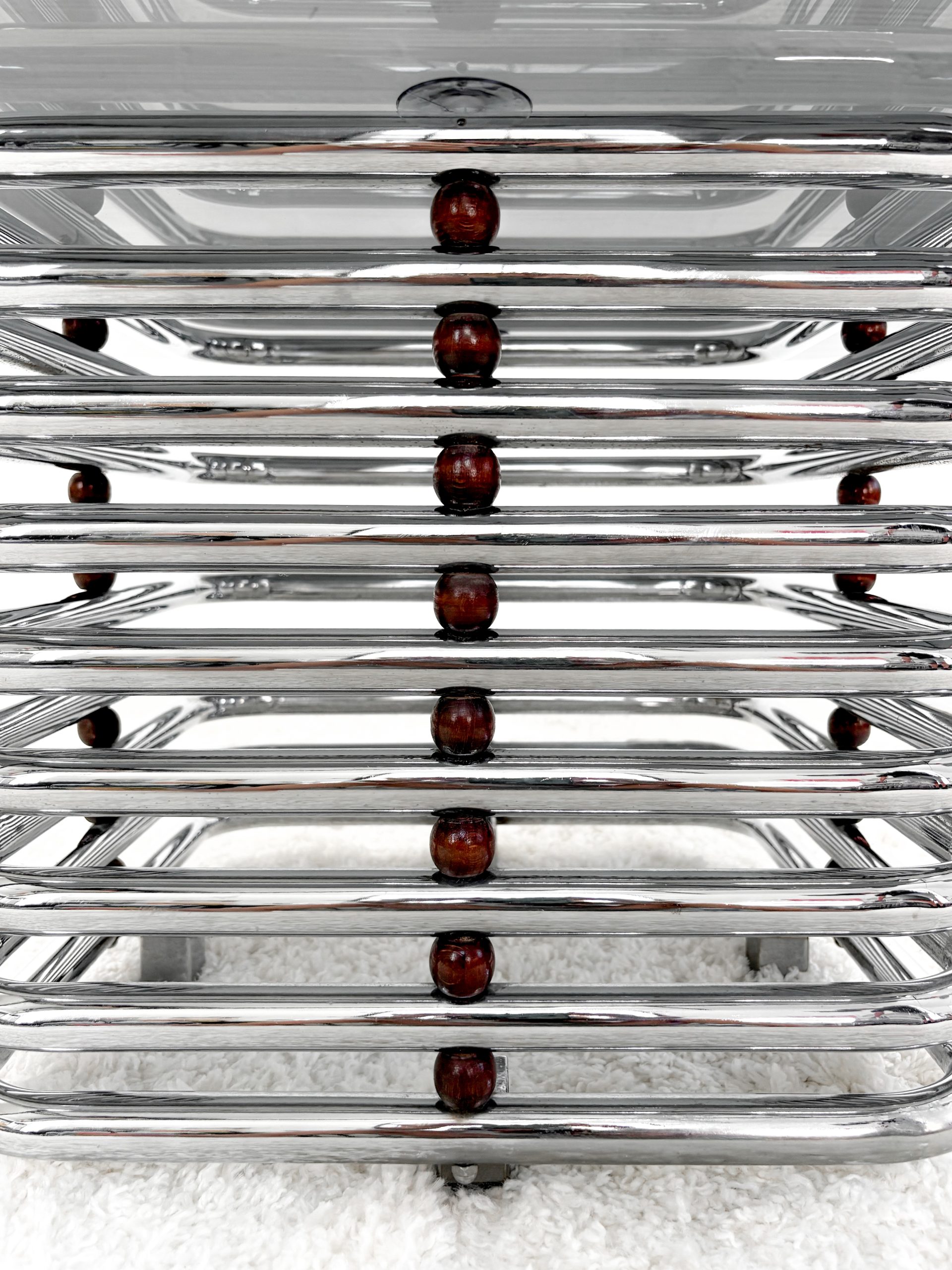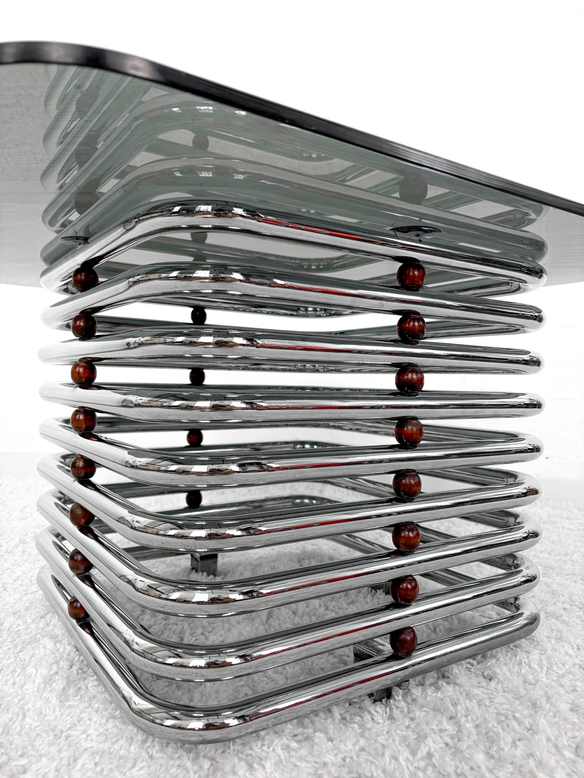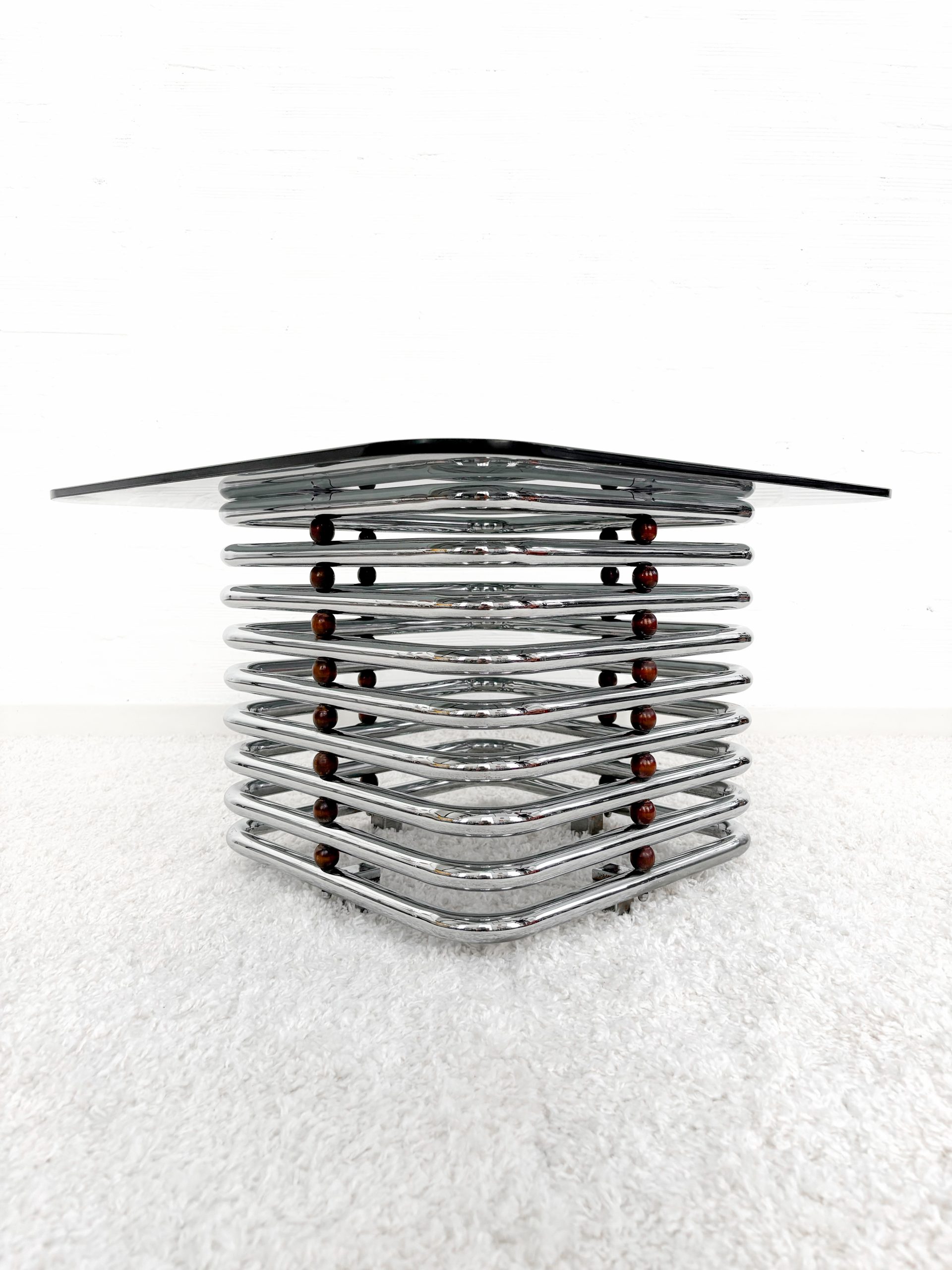 Mesa de centro con estructura tubular en acero cromado con detalles en madera, c.1997. Sobre en cristal fumé en negro.