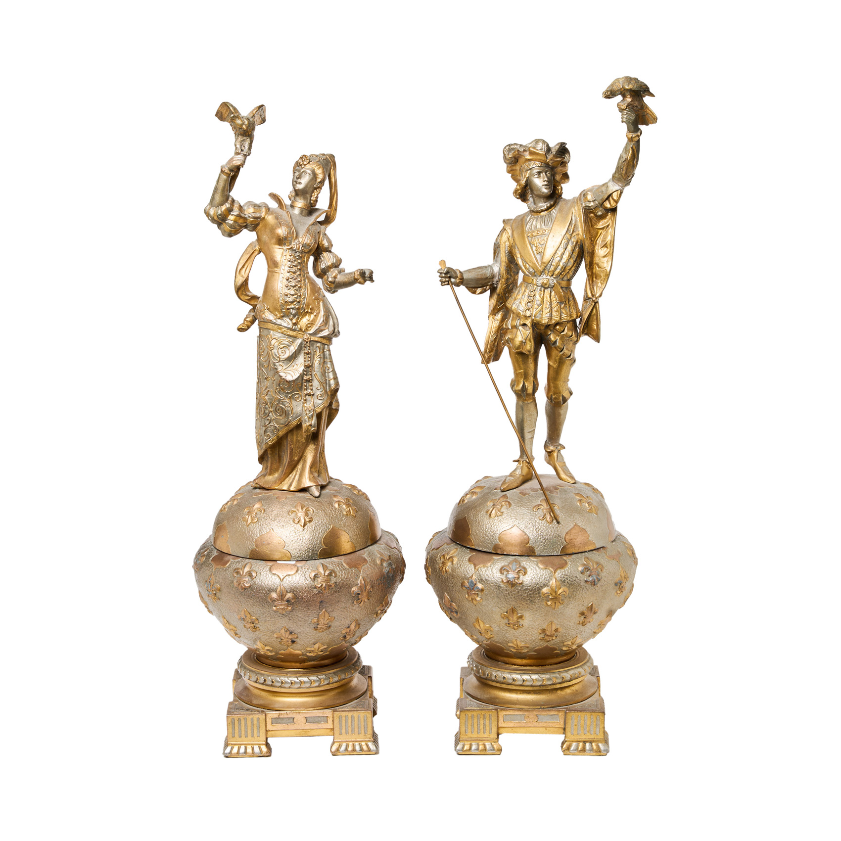 Pareja de centros bombonera en metal patinado en tonos cobres y dorados coronados por figuras galantes portando aves, ppios. del s.XX.