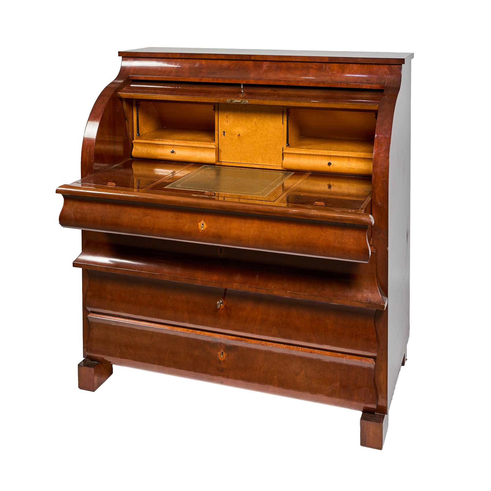 Bureau de cilindro inglés en madera de caoba con tres cajones al frente y parte superior con tapa abatible con escritorio-secreter compartimentado al interior y sobre en piel gofrada, s.XIX. Adjunta llaves.