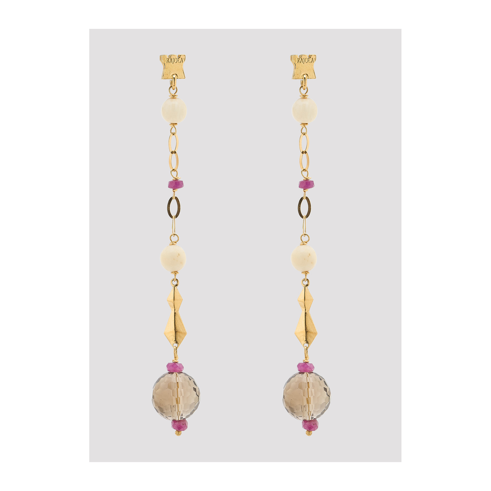 Pendientes largos en oro con cuentas circulares de cuarzo fumé 10 mm, marfilina 5 mm y rubíes de 3 mm.