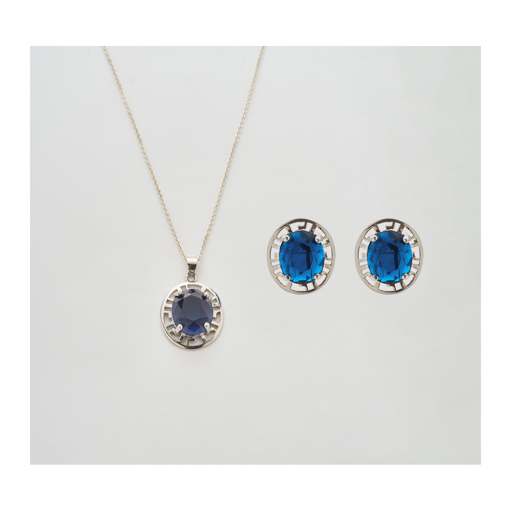 Juego de pendientes, cadena y colgante con símil de zafiro azul talla oval de 15 x 13 y 13 x 11 mm. y orla calada.