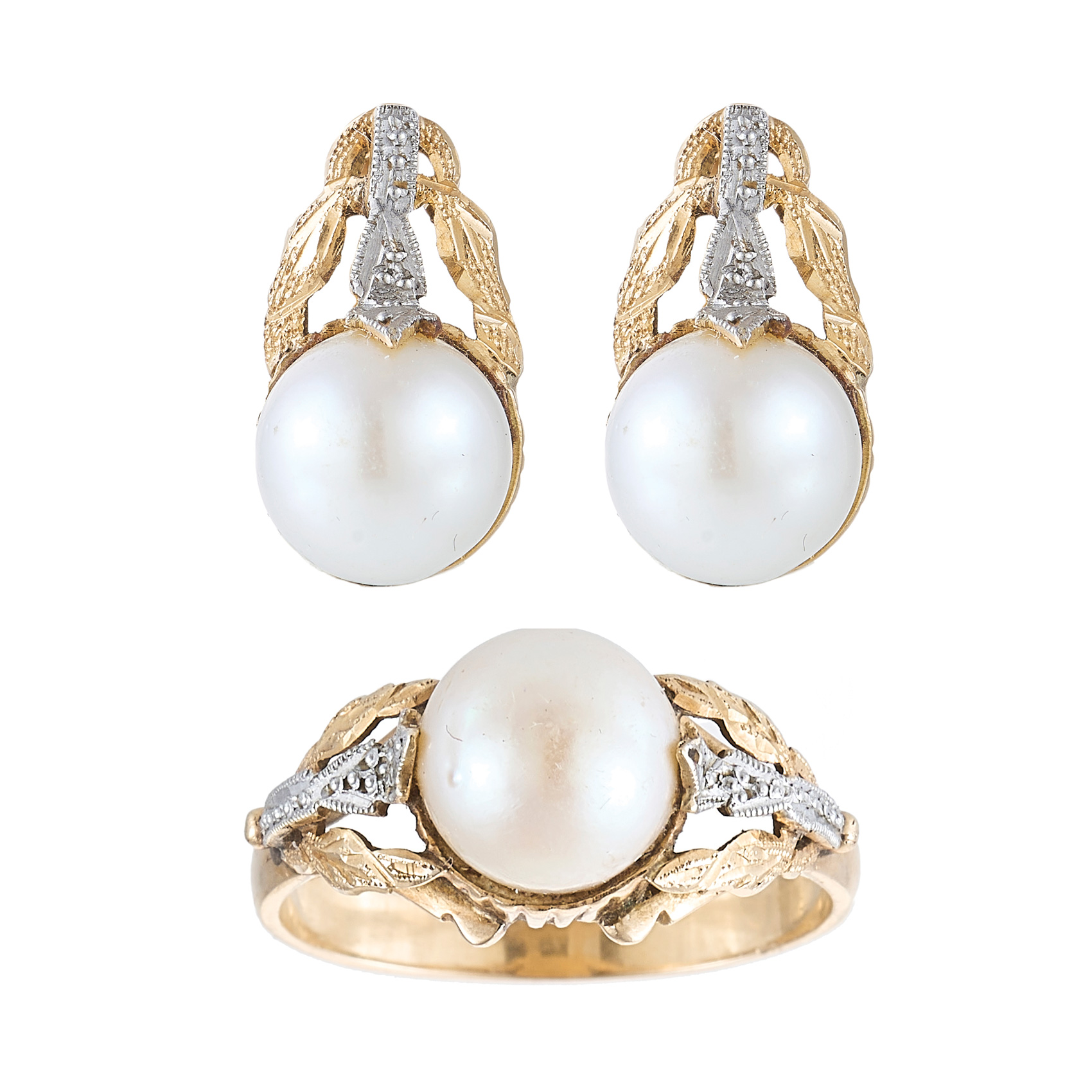 Juego de pendientes y sortija en oro y vistas en platino con perla cultivada de 7,5 – 8,5 mm. c.1950.