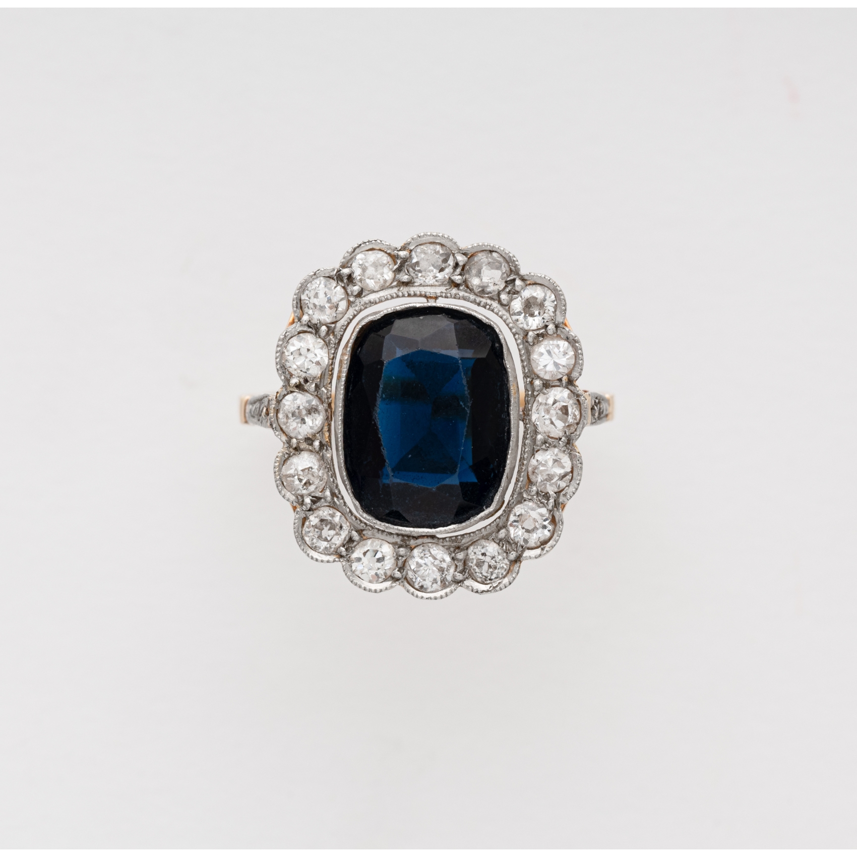 Sortija en oro y platino, centro de símil de zafiro 11 x 8 mm, con diamantes talla antigua c.1940.