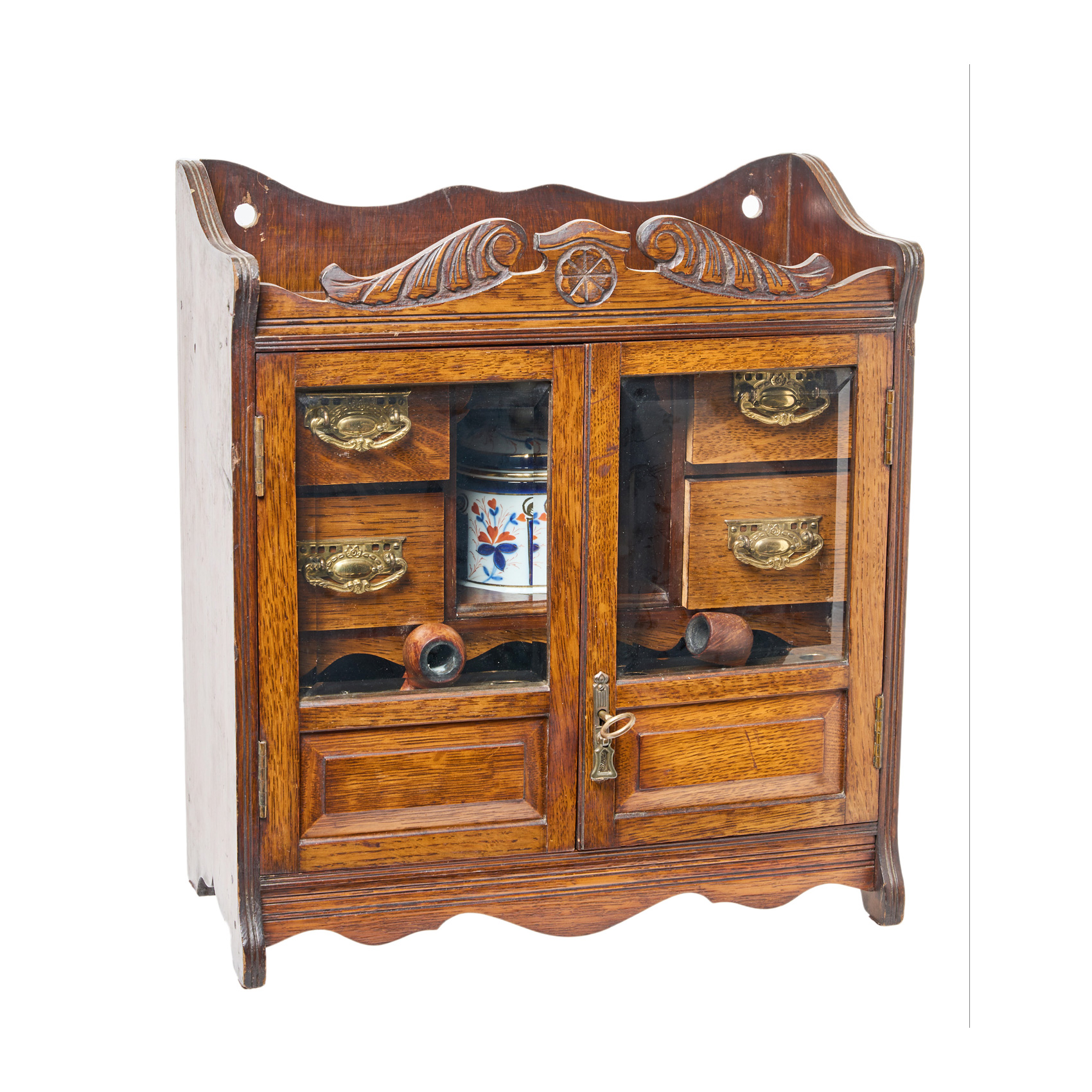 Armario pipera en madera de roble, c.1920. Puertas acristaladas e interior compartimentado con cuatro cajones. Se acompaña de dos pipas en madera y recipiente para tabaco en porcelana esmaltada. Adjunta llave.